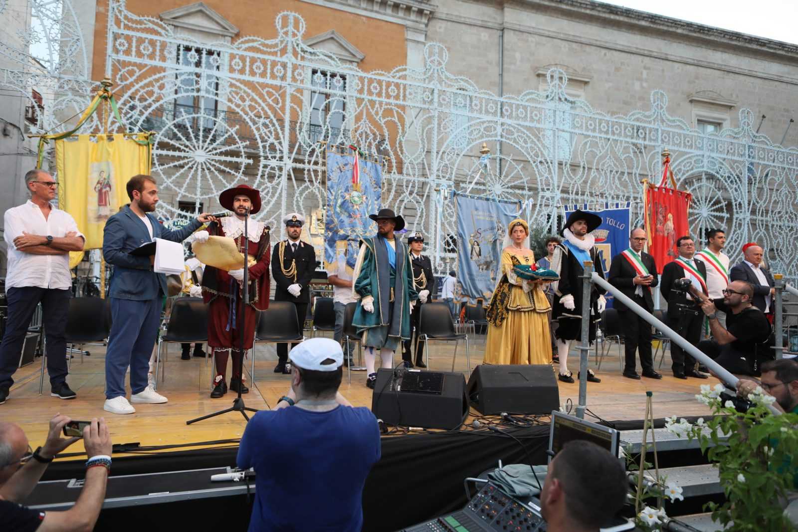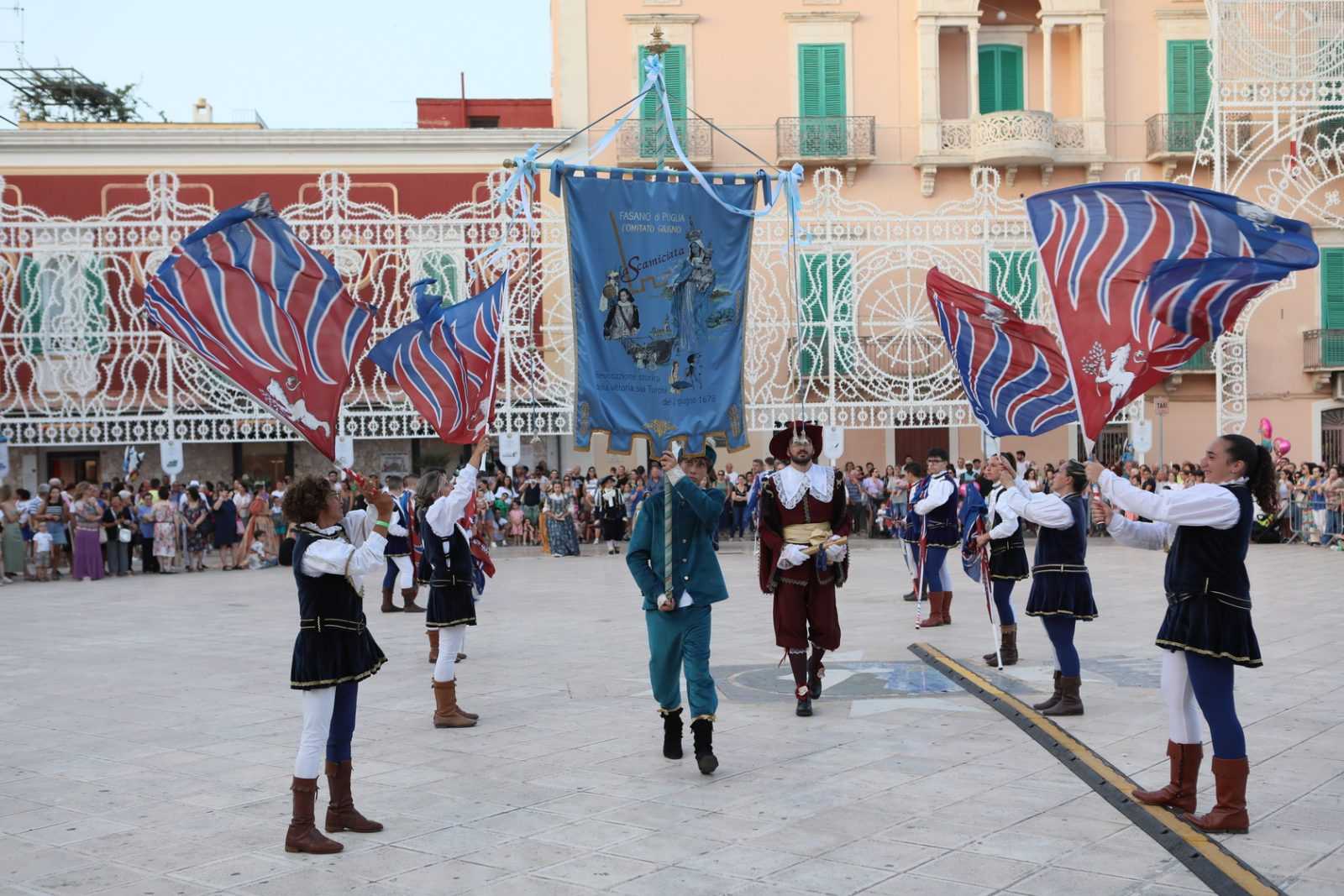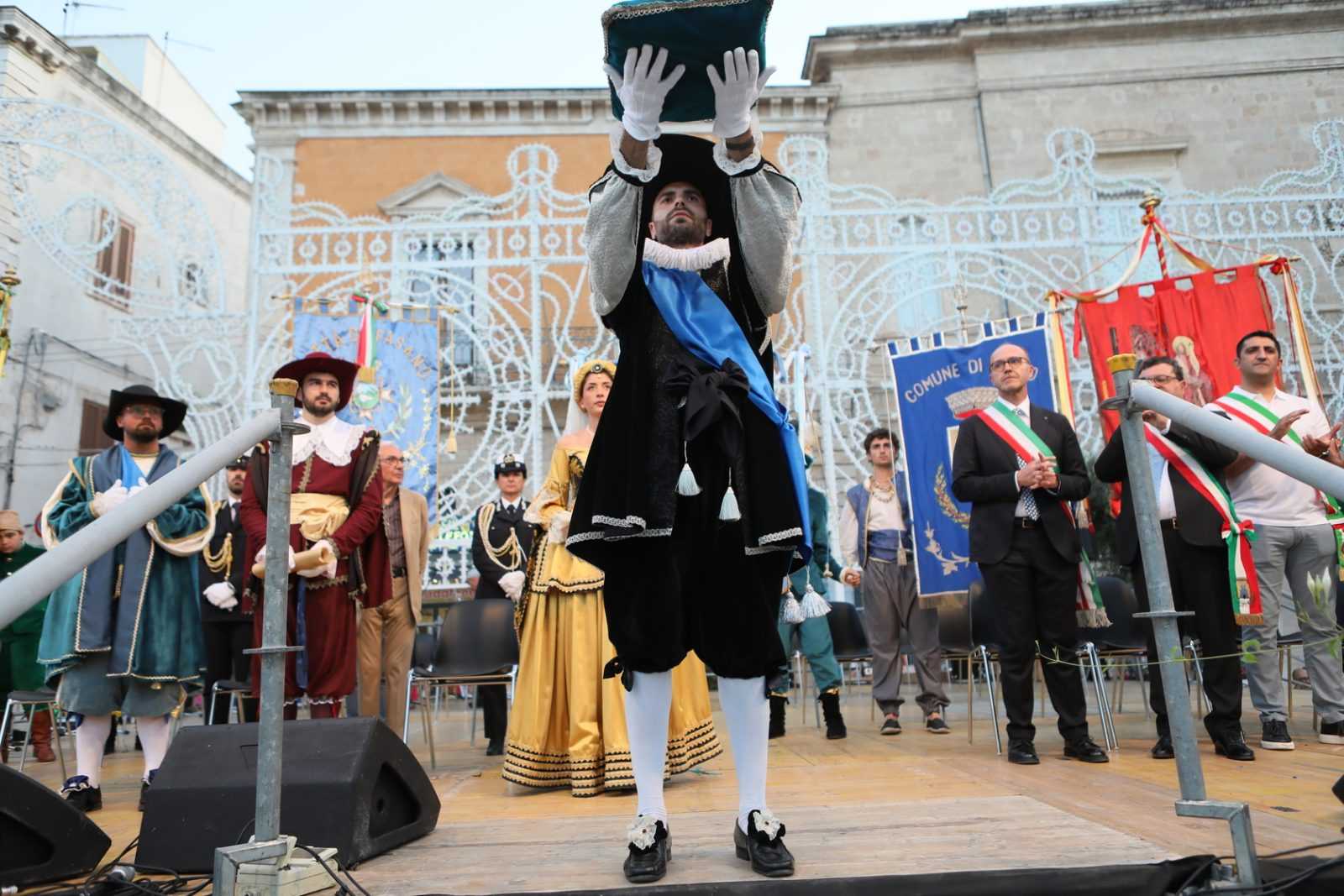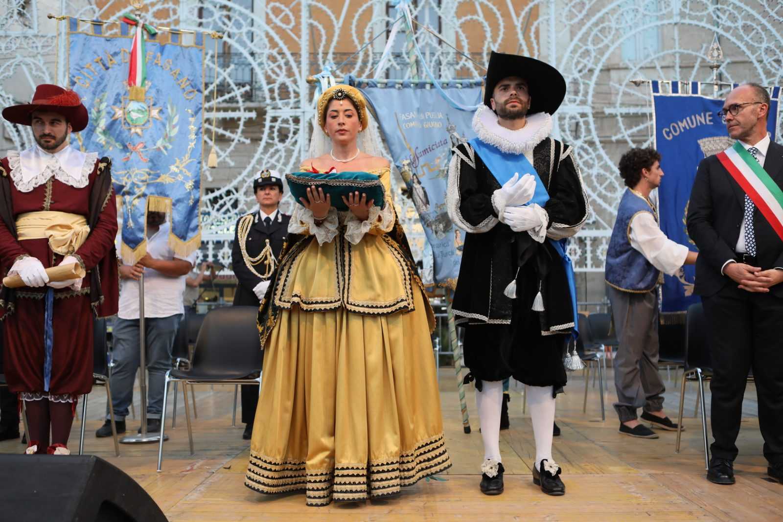 La suggestiva cerimonia della consegna delle chiavi della città ha rappresentato uno dei momenti più emozionanti della serata. Il sindaco di Fasano, Francesco Zaccaria, ha simbolicamente consegnato le chiavi nelle mani del sindaco figurante, Pompeo Mignozza, donate poi ai Santi Patroni.