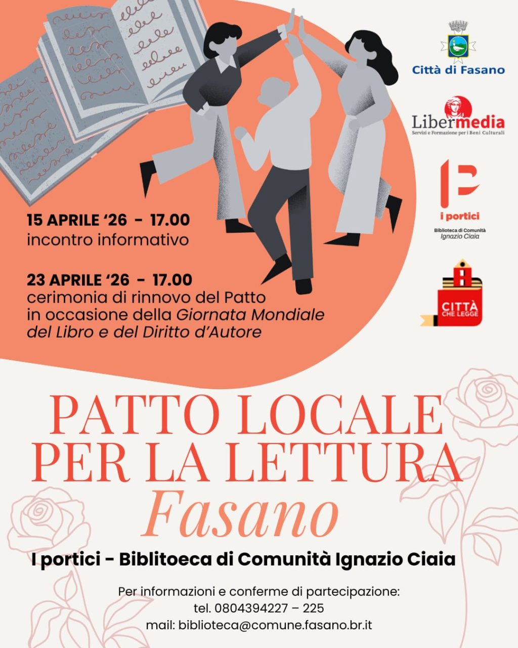 L’invito è aperto a tutti gli organismi che operano nel settore culturale e che intendono impegnarsi in un’azione collettiva di promozione della lettura. La manifestazione di interesse, completa di tutta la documentazione richiesta, dovrà pervenire, su apposito modulo, entro il 19 aprile 2026 via PEC (comunefasano@pec.rupar.puglia.it) o tramite posta elettronica (biblioteca@comune.fasano.br.it ), riportando nell’oggetto: “Adesione al Patto Locale per la Lettura della Città di Fasano”.