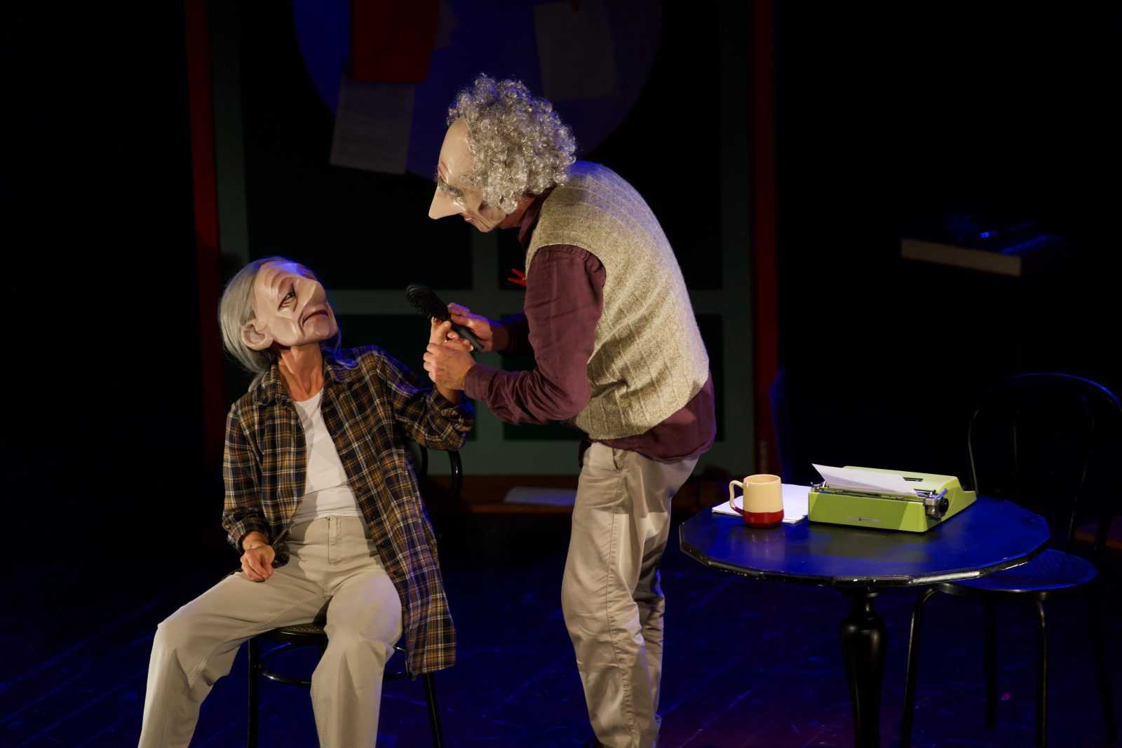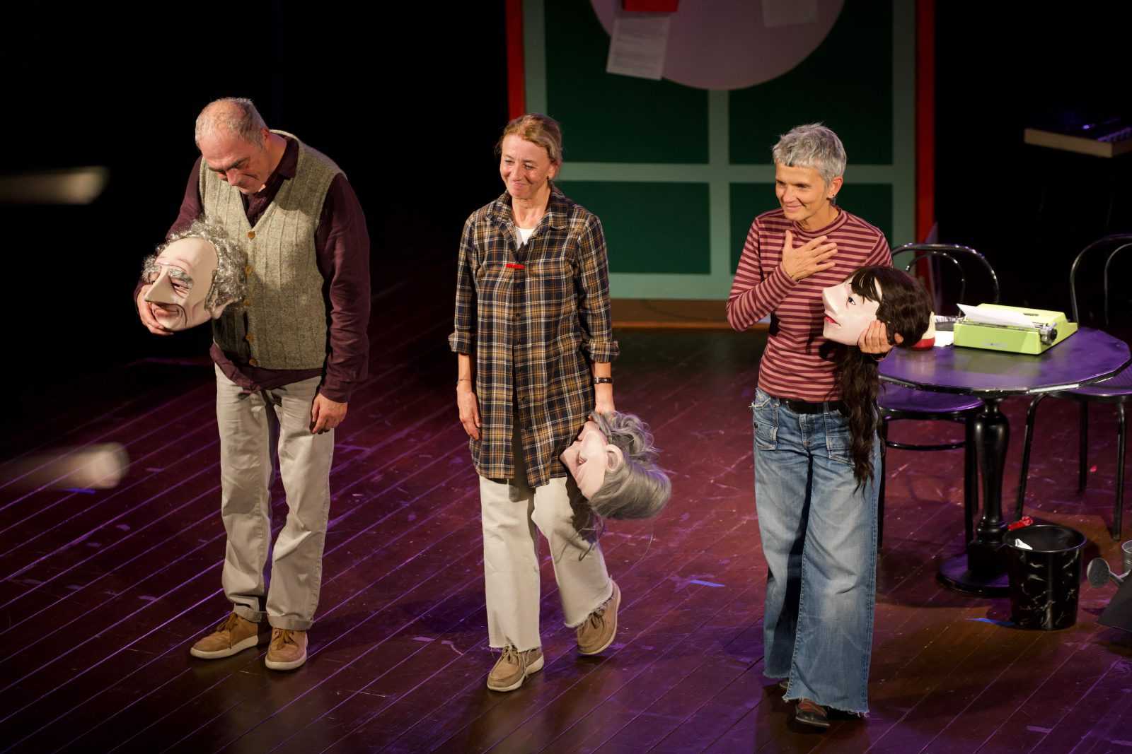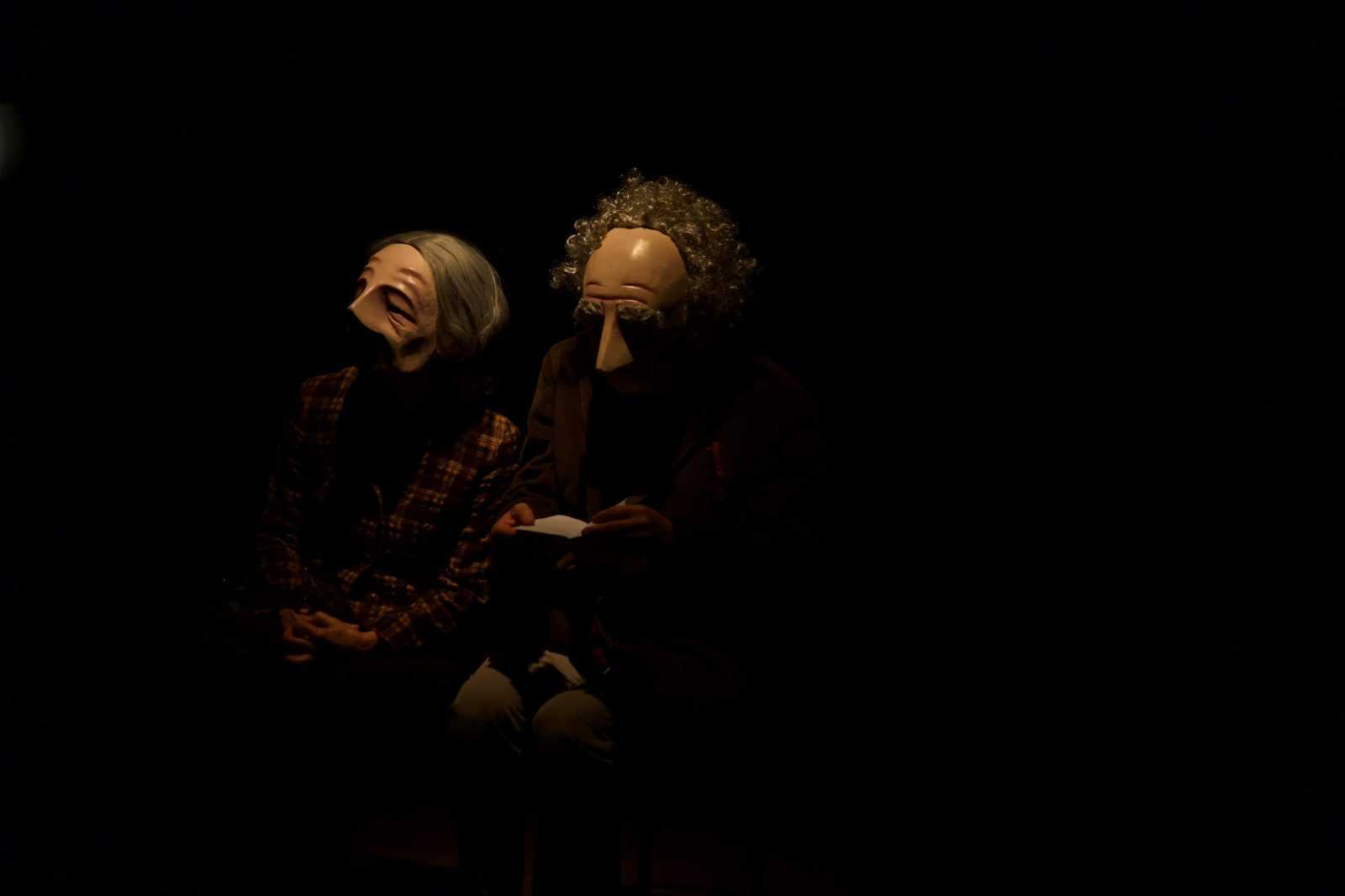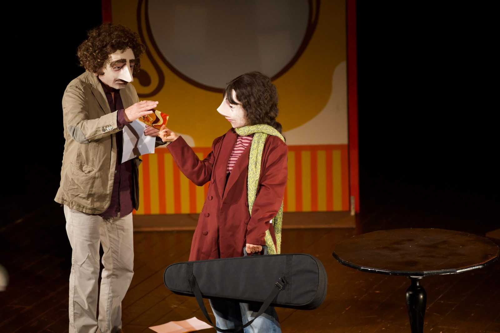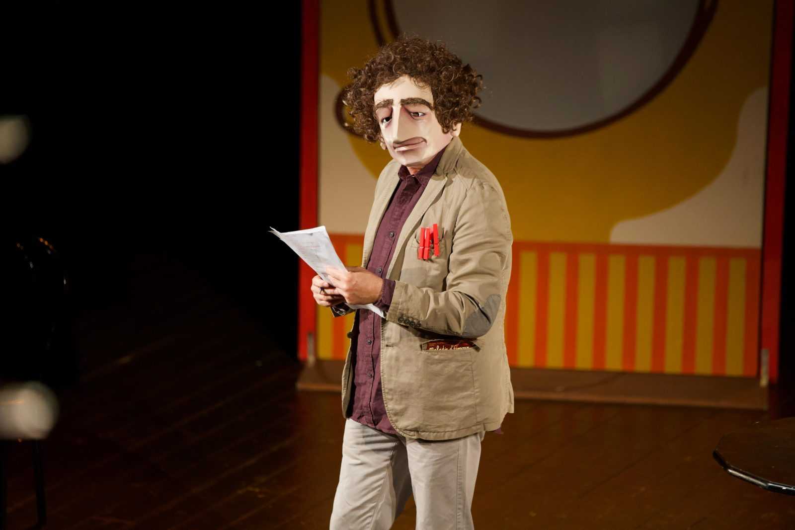 In campo non la loro voce – durante l’intera pièce non viene pronunciata una singola battuta – né il loro sguardo – coperto da buffe maschere monoespressive – ma solo la loro gestualità.
