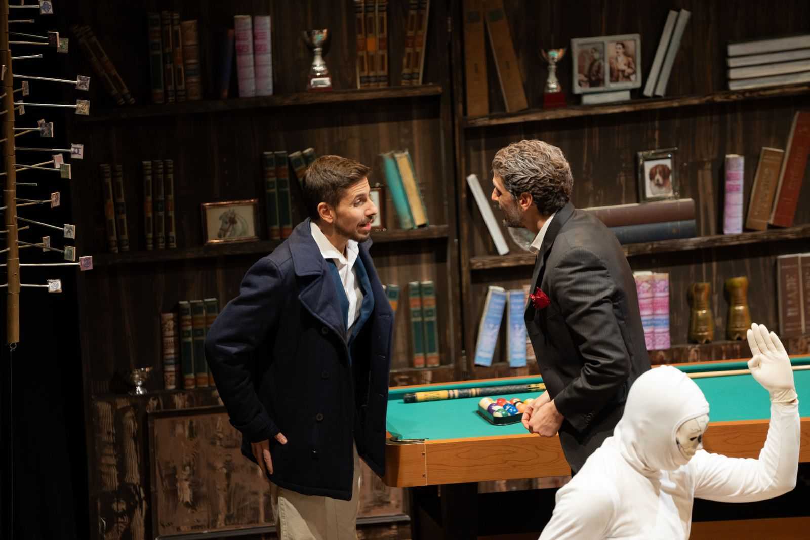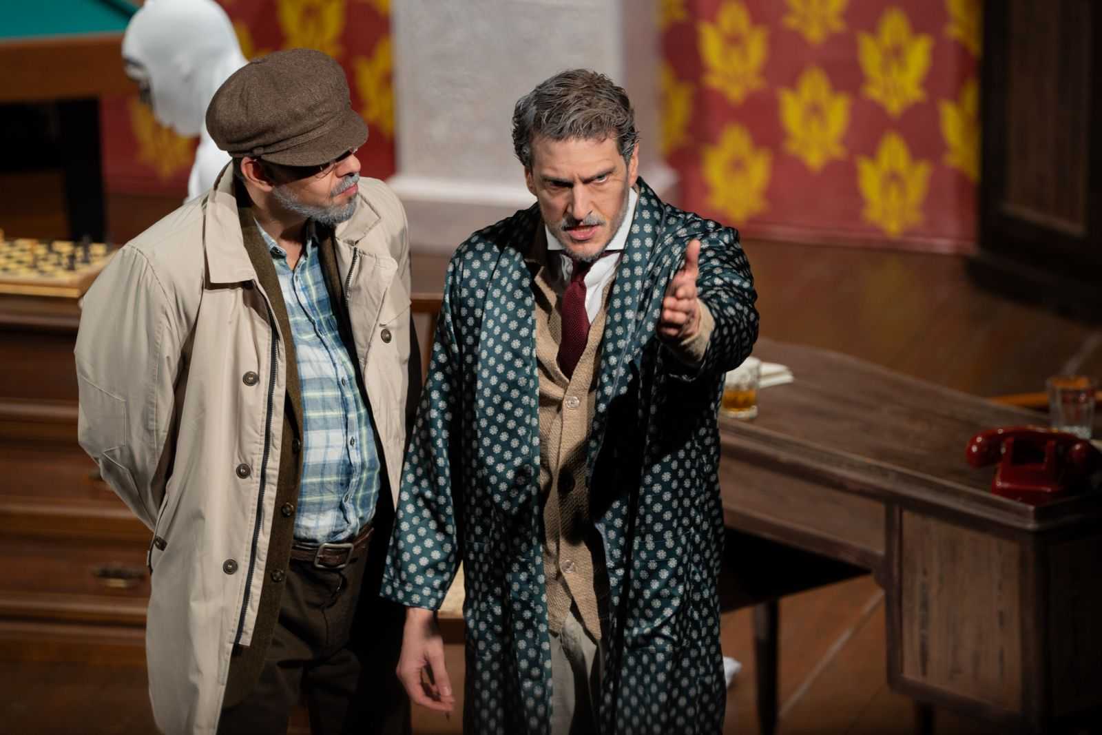 Il primo atto si apre nella lussuosa magione comense di Alfredo Castiglioni (Mattia Nodari), affermato giallista che, dopo aver scoperto che Domenico Marinelli (Fabrizio Perrone), un umile pasticcere di origini meridionali, ha una relazione con la moglie Margherita, lo invita con uno stratagemma per mettere in scena un gioco perverso.