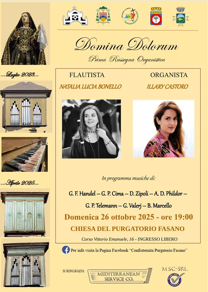 FASANO – La rassegna organistica “Domina Dolorum”, promossa dalla locale confraternita con la direzione artistica del M° Ciro Greco, ritorna domenica 26 ottobre alle ore 19:00 presso la Chiesa del Purgatorio di Fasano, alle ore 19, con ingresso libero.