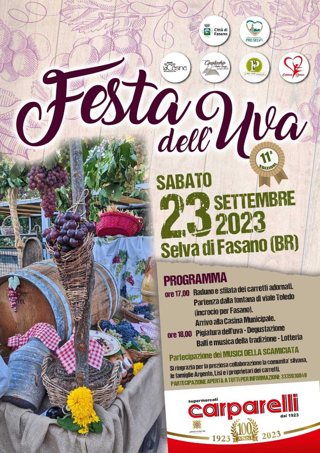FASANO – Si svolgerà sabato 23 settembre, a Selva di Fasano, l’11ª edizione della “Festa dell’Uva”, che si svolgerà in viale Toledo e presso la Casina Municipale.