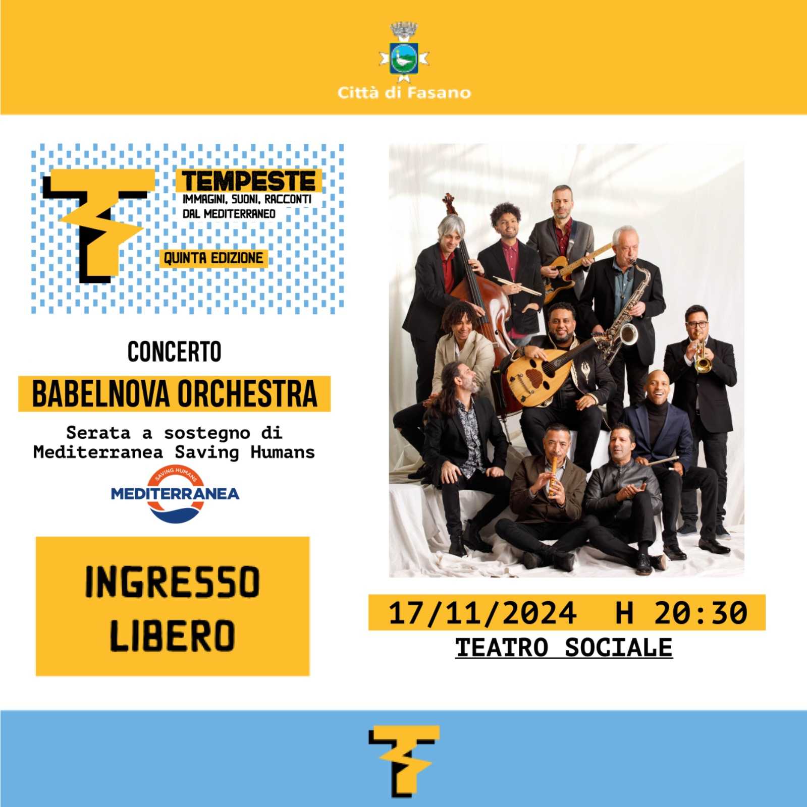Alle ore 20.30 al Teatro Sociale, il concerto gratuito della “BabelNovaOrchestra” con “Mediterranea Saving Humans”. Una serata dedicata alla musica, alle migrazioni e ai racconti di chi attraversa il mare. Al Teatro Sociale di Fasano uno spettacolo gratuito con la “BabelNova Orchestra”, che ha debuttato sul palco dell’Ariston al Festival di Sanremo, duettando con Dargen D’Amico, e con i volontari di “Mediterranea Saving Humans” per raccogliere fondi a sostegno dei salvataggi in mare.