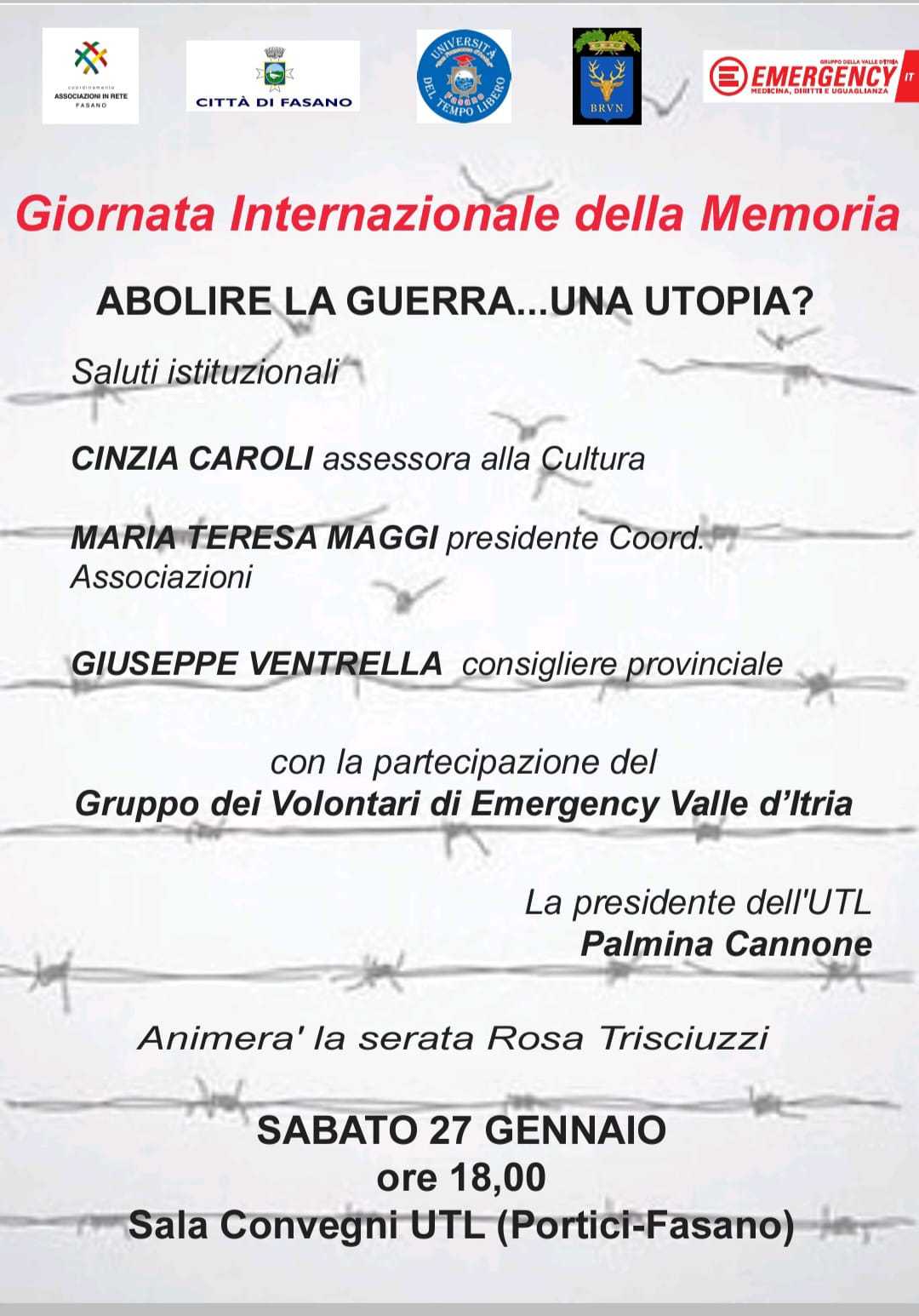 FASANO – Oggi, sabato 27 gennaio, l’UTL, Emergency e il Coordinamento delle Associazioni Fasanesi, alle ore 18,00, nella Sala convegni della locale Università del Tempo Libero (Portici), celebreranno la Giornata Internazionale della Memoria.