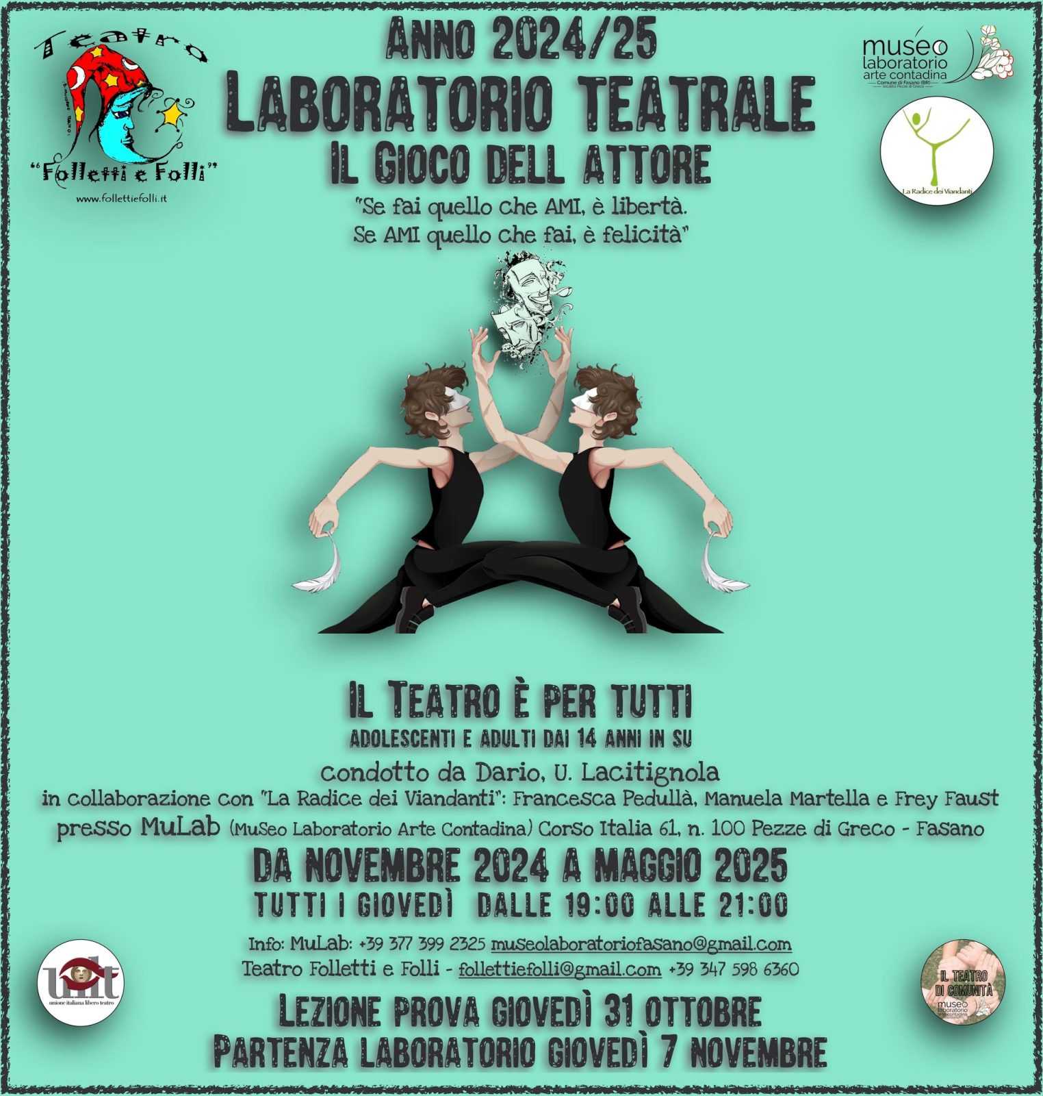 PEZZE DI GRECO – Teatro Folletti e Folli rinnova l’invito a partecipare al laboratorio teatrale “Il Gioco dell’attore”, quest’anno affiancato da interventi della compagnia “La Radice dei Viandanti”.