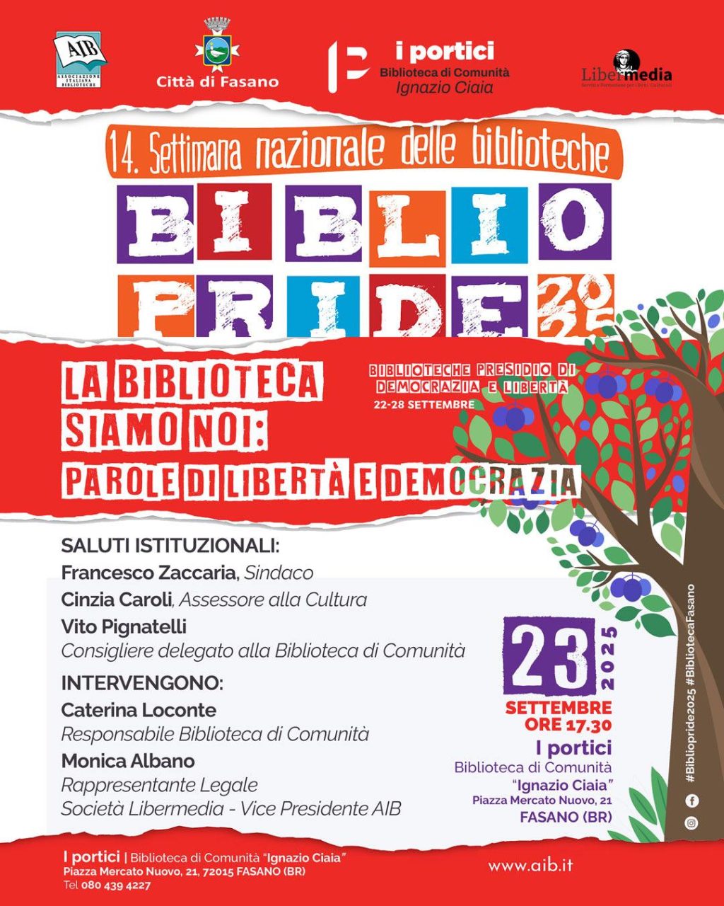 FASANO – Il Comune di Fasano è lieto di invitare la stampa e la cittadinanza a un incontro pubblico che si terrà martedì 23 settembre alle ore 17.30 presso “I portici – Biblioteca di Comunità Ignazio Ciaia”. L’evento, intitolato “La Biblioteca siamo noi: parole di libertà e democrazia”, si svolge in occasione del Bibliopride 2025, la Giornata nazionale delle biblioteche promossa dall’Associazione Italiana Biblioteche (AIB).
