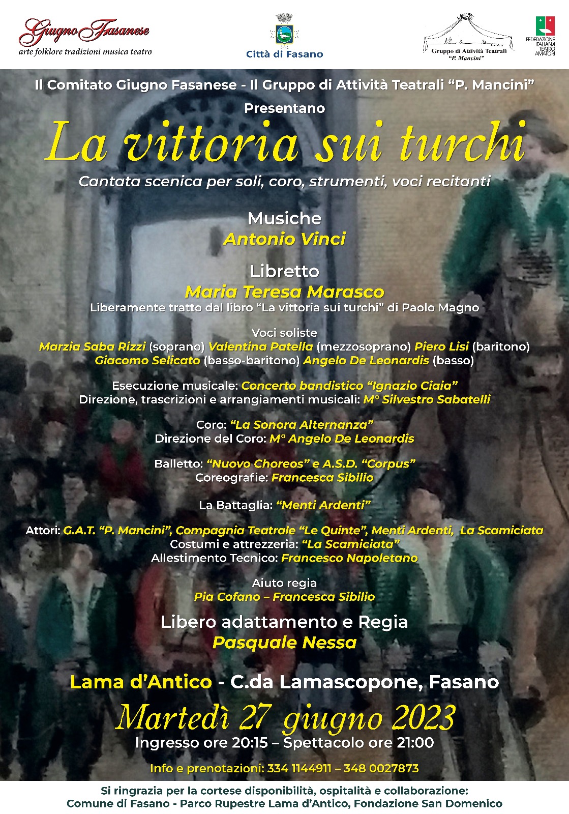 «Torniamo a cimentarci con uno spettacolo complesso e complicato quale “La Vittoria sui Turchi” – dice Fausto Savoia, presidente del GAT Mancini – giunto alla V edizione e che, dallo scorso anno, ha subito una “metamorfosi” integrando l’aspetto prevalentemente concertistico con una lettura più specificatamente teatrale. Naturalmente, come già avvenuto nella scorsa edizione, resta immutata l’impalcatura portante della “Cantata”. Naturalmente il grazie del GAT Mancini e del Giugno Fasanese va a tutte le componenti del cast. Altro aspetto che voglio, con Lucio Legrottaglie (presidente del Comitato Giugno Fasanese ndr), sottolineare, è la scelta della location “caduta” su un luogo fortemente simbolico della storia, ormai millenaria, del nostro territorio: Lama d’Antico. Qui cogliamo l’occasione per ringraziare la Fondazione San Domenico ed il Comune di Fasano per averci concesso questa opportunità. Invitiamo tutti a ad assistere allo spettacolo che chiuderà ufficialmente la 45° edizione del Giugno Fasanese».