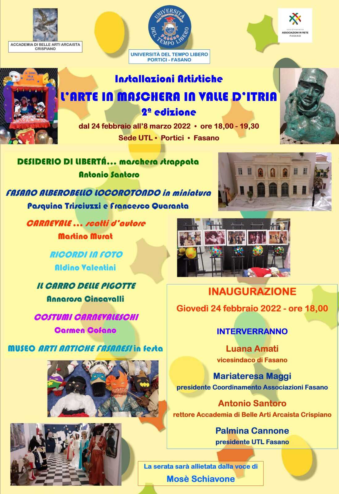 FASANO – L’ Università del Tempo Libero di Fasano, dopo la Mostra Internazionale I Presepi del Chiostro, in occasione del Carnevale, dal 24 febbraio all’8 marzo 2022, ore 18.00-19.30, nella propria sede dei Portici a Fasano, promuove la seconda edizione dell’iniziativa L’Arte in maschera in Valle d’Itria, con una serie di installazioni artistiche da ammirare in tutta la loro bellezza. Sono partner: il Coordinamento delle Associazioni di Fasano e l’Accademia di Belle Arti Arcaista di Crispiano.