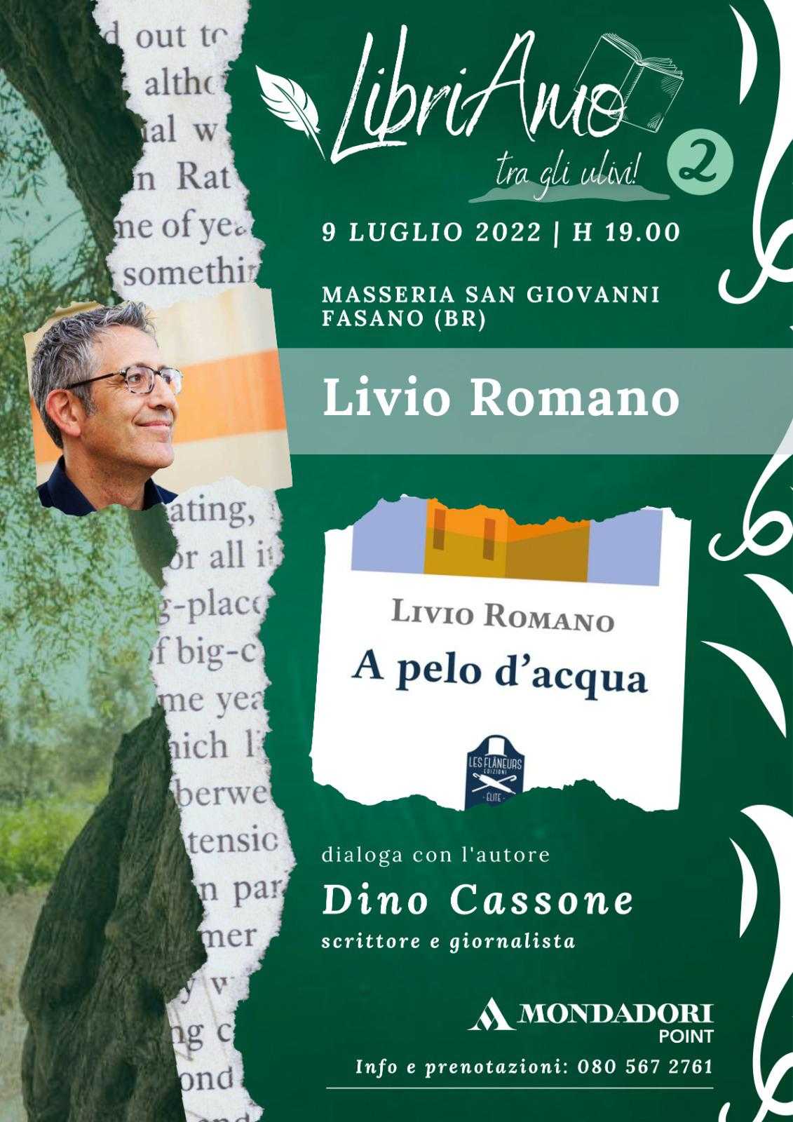 FASANO – Prosegue nella serata di domani – sabato 9 luglio – il ciclo di incontri di “LibriAmo…tra gli ulivi!”, la rassegna fortemente voluta dall’imprenditrice Laura De Mola, e organizzata dal Mondadori Point di Fasano, con il quarto appuntamento, alle ore 19.00, presso Masseria San Giovanni, in c. da Ottava, con lo scrittore salentino Livio Romano.
