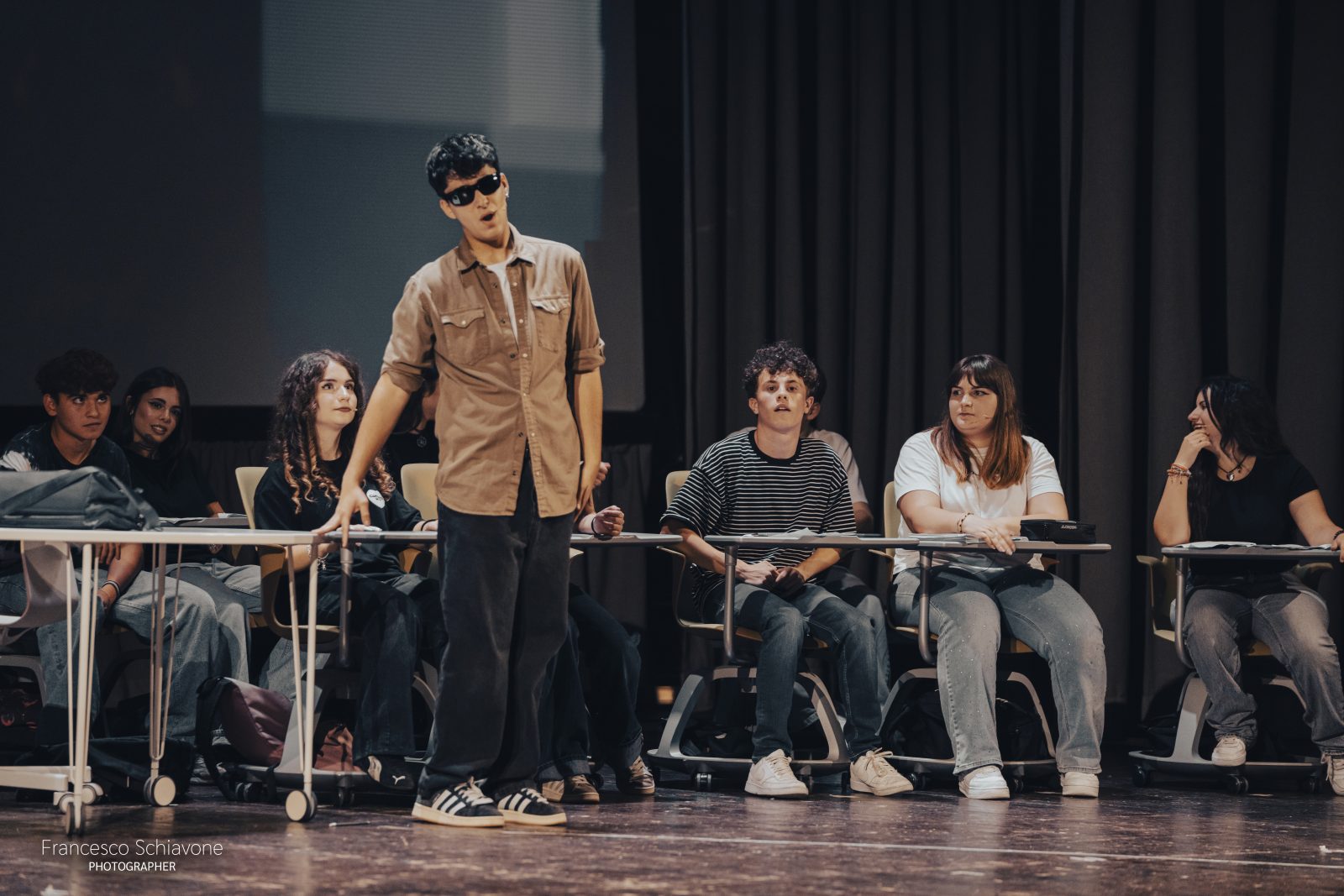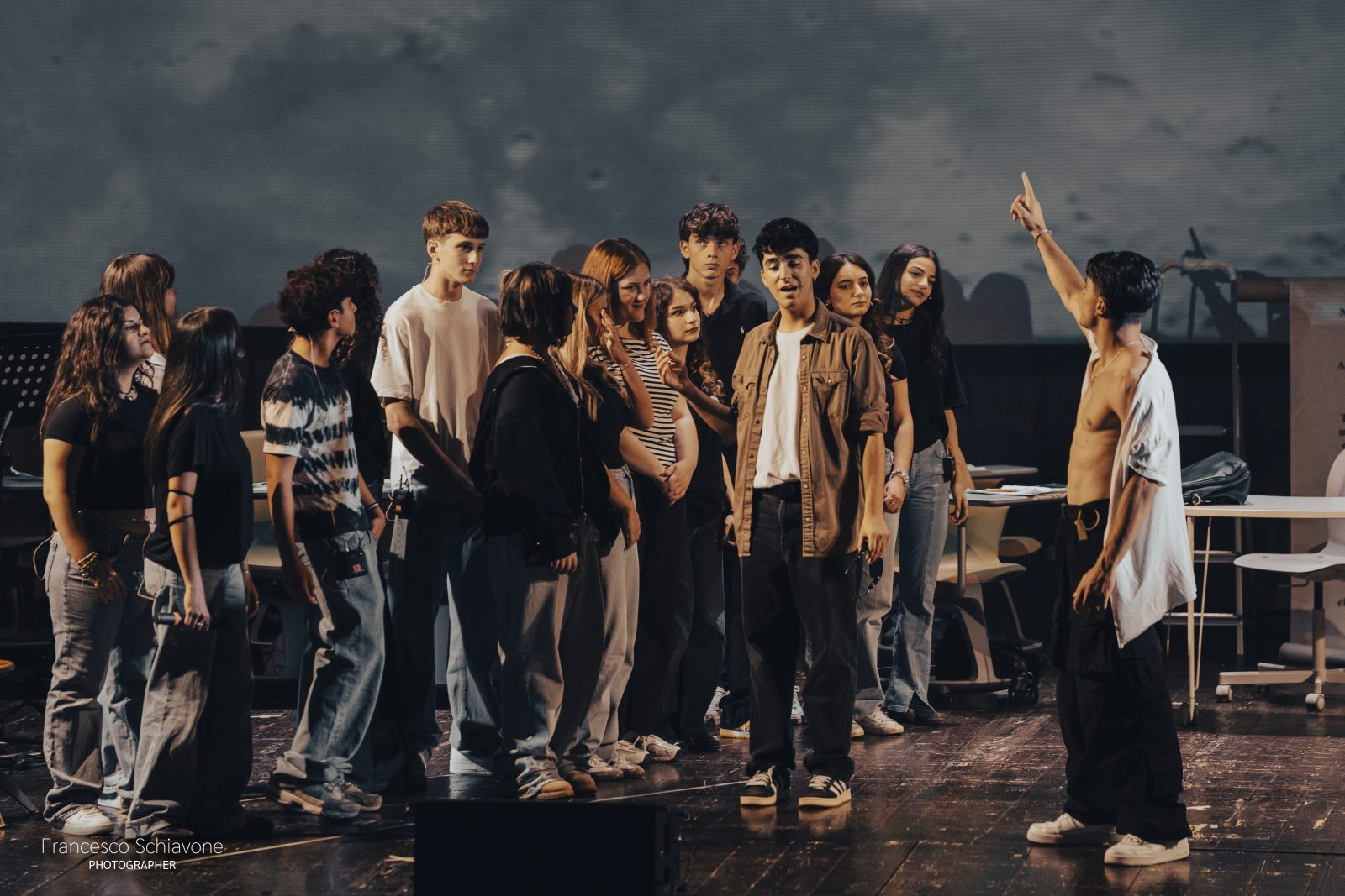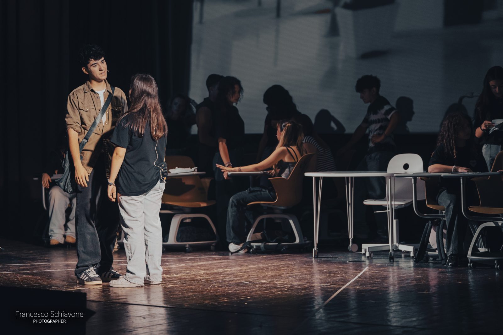 Più di 100 ragazzi e ragazze hanno preso parte allo spettacolo che racconta il difficile tema dell’adolescenza, quell’invisibile cortina che tiene separati gli studenti da chi più dovrebbe ascoltarli: la famiglia, la scuola, forse loro stessi. Quegli occhi “diversi dagli adulti, che coltivano l’arte del dubbio e che aiuta i giovani ad affrontare le sfide del presente“, come ha precisato il Dirigente Scolastico Vita Ventrella nei saluti iniziali.