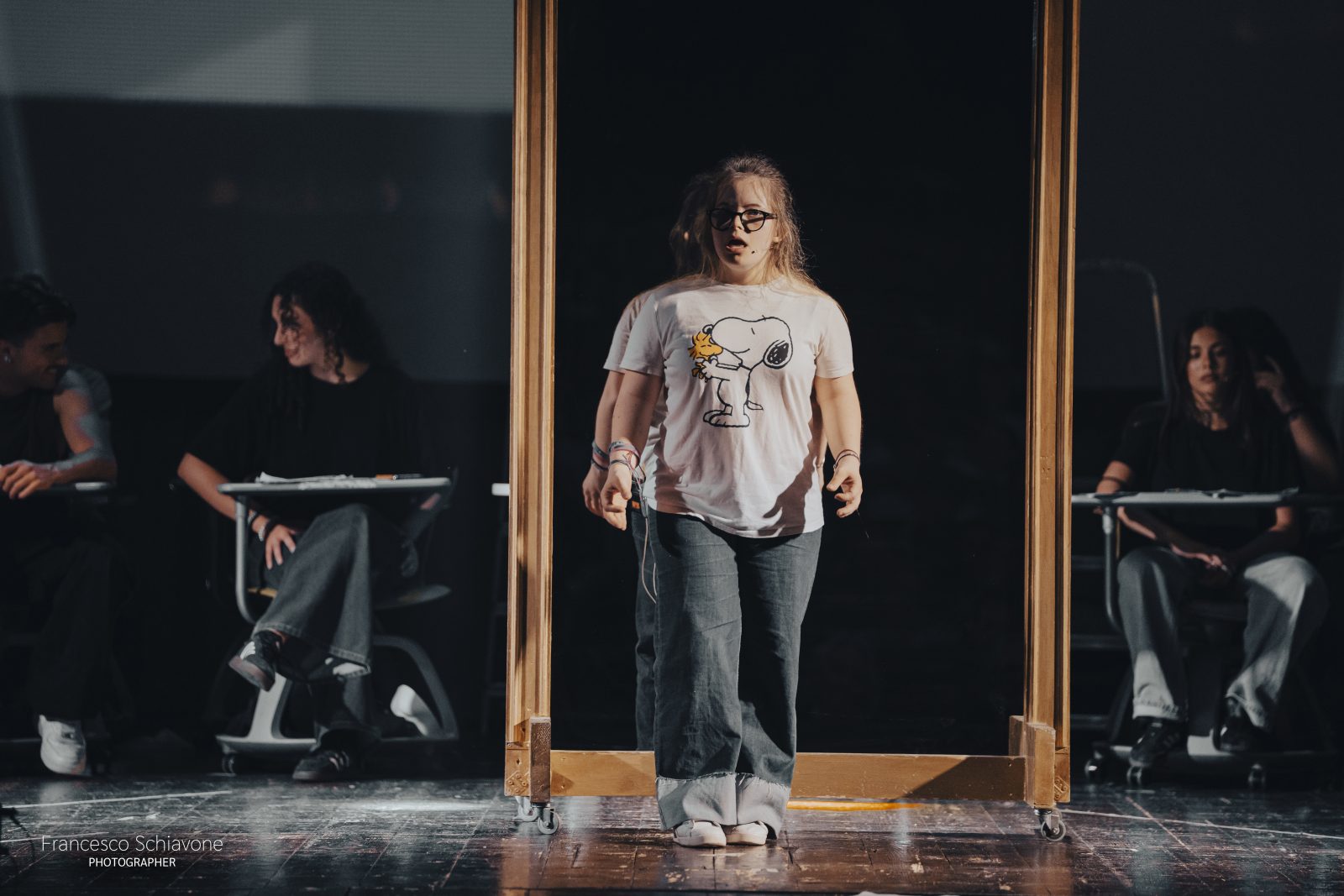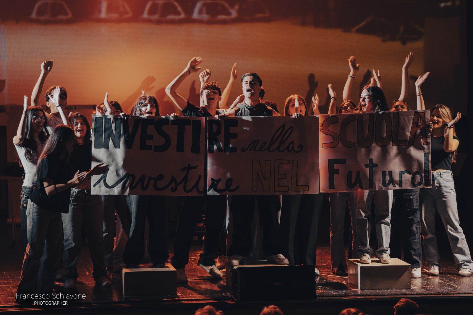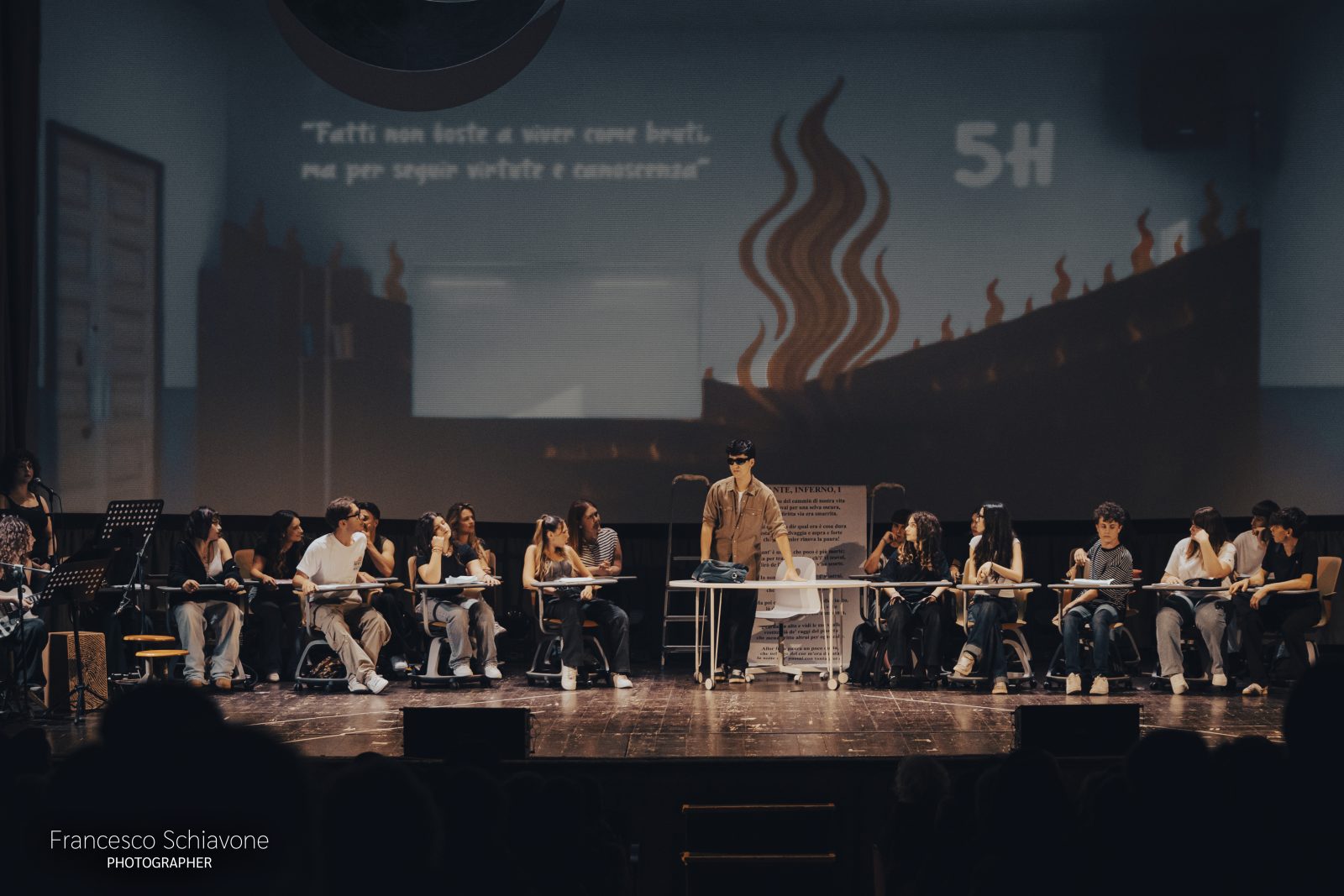 Più di 100 ragazzi e ragazze hanno preso parte allo spettacolo che racconta il difficile tema dell’adolescenza, quell’invisibile cortina che tiene separati gli studenti da chi più dovrebbe ascoltarli: la famiglia, la scuola, forse loro stessi. Quegli occhi “diversi dagli adulti, che coltivano l’arte del dubbio e che aiuta i giovani ad affrontare le sfide del presente“, come ha precisato il Dirigente Scolastico Vita Ventrella nei saluti iniziali.
