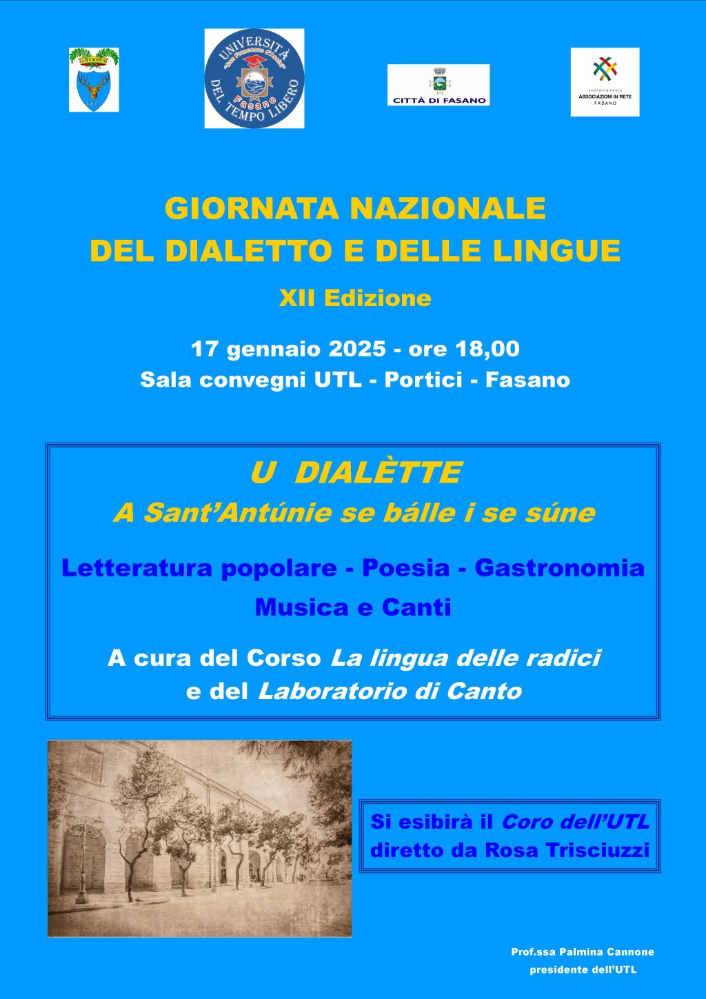 FASANO – Oggi, 17 gennaio, alle ore 18:00, nella propria Sala convegni (Portici- Fasano), la locale Università del Tempo Libero celebra la Giornata Nazionale del Dialetto e delle Lingue Locali, per il dodicesimo anno consecutivo.