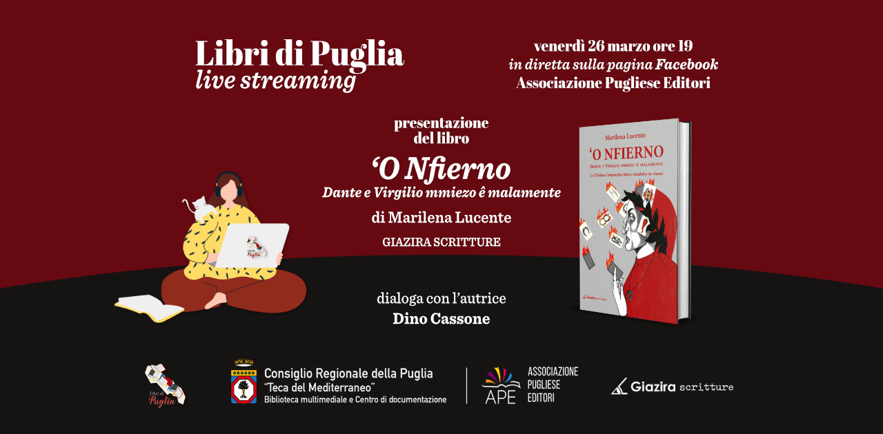 FASANO – Il nuovo aperitivo letterario di “Libri di Puglia live streaming” sarà dedicato al Dantedì. L’iniziativa, promossa dall’Associazione Pugliese Editori e dalla Biblioteca del Consiglio regionale pugliese “Teca del Mediterraneo” per incentivare la lettura e diffondere la cultura del libro che ogni venerdì ospita incontri con gli autori in diretta streaming sulla pagina Facebook dell’Associazione Pugliese Editori, infatti, questa settimana sarà dedicata al Sommo Poeta. A 700 anni dalla morte di Dante, il cui viaggio ultraterreno gli studiosi fanno iniziare il 25 marzo, venerdì 26 marzo alle ore 19 il giornalista fasanese Dino Cassone incontra Marilena Lucente, autrice del libro “‘O Nfierno. Dante e Virgilio mmiezo ê malamente – La Divina Commedia letta e tradotta in classe“, edito da Giazira Scritture.