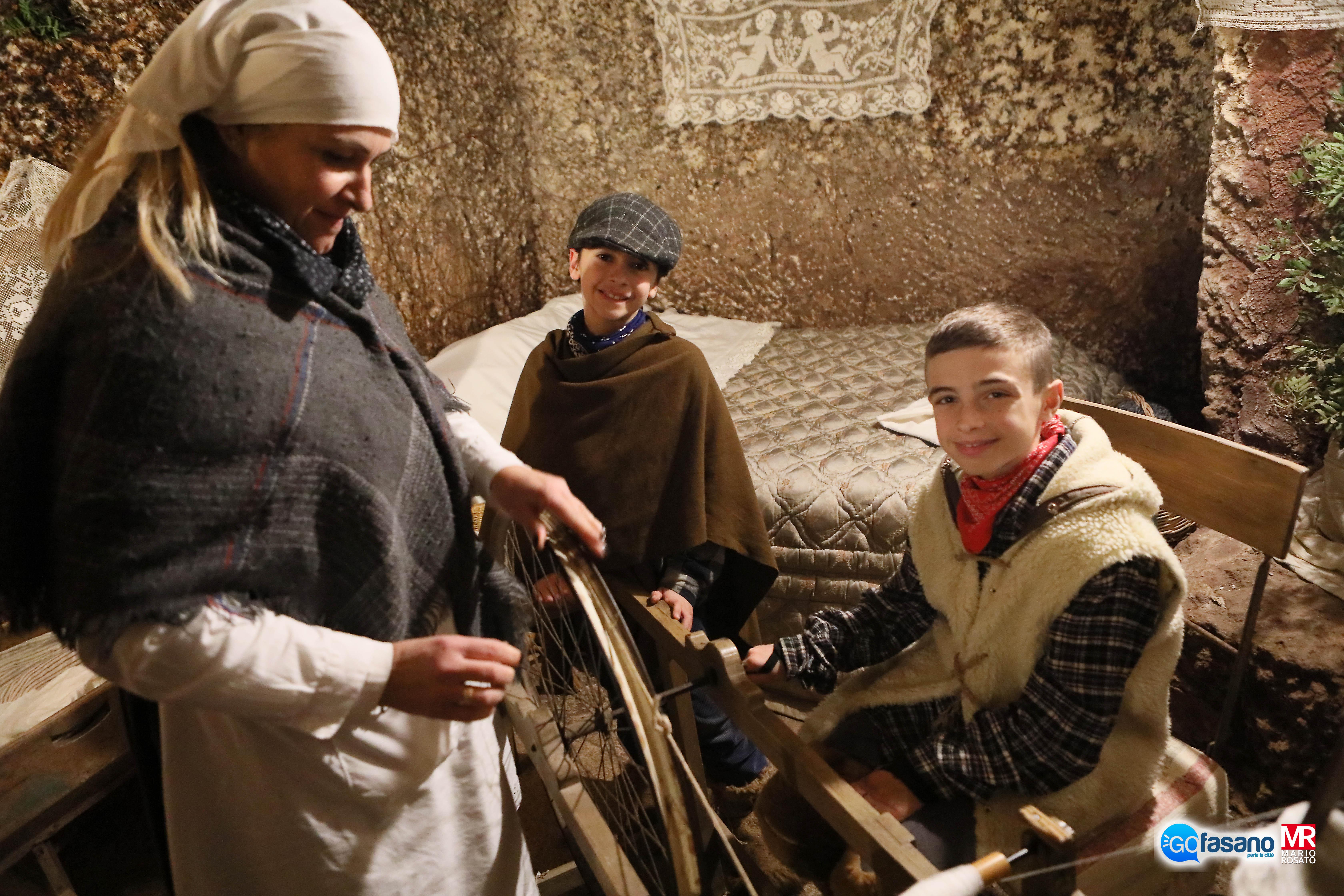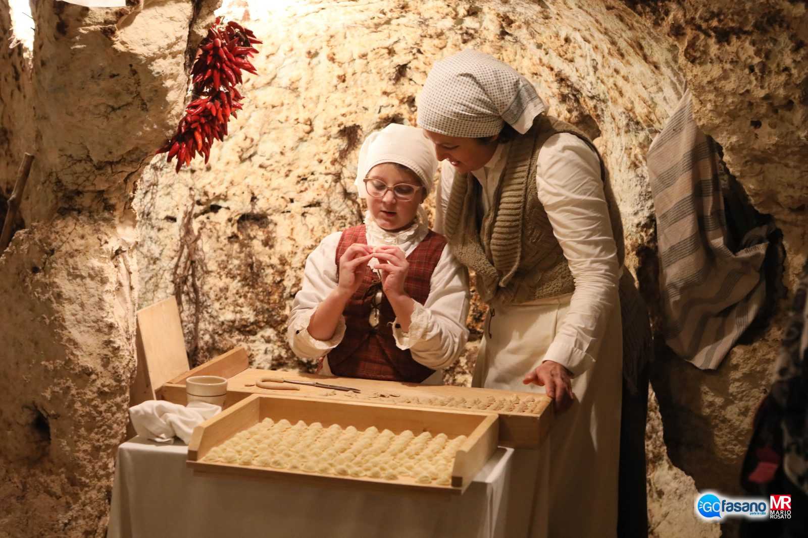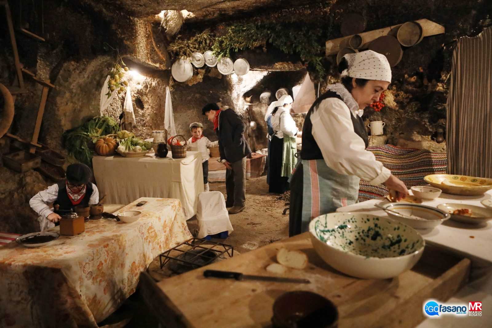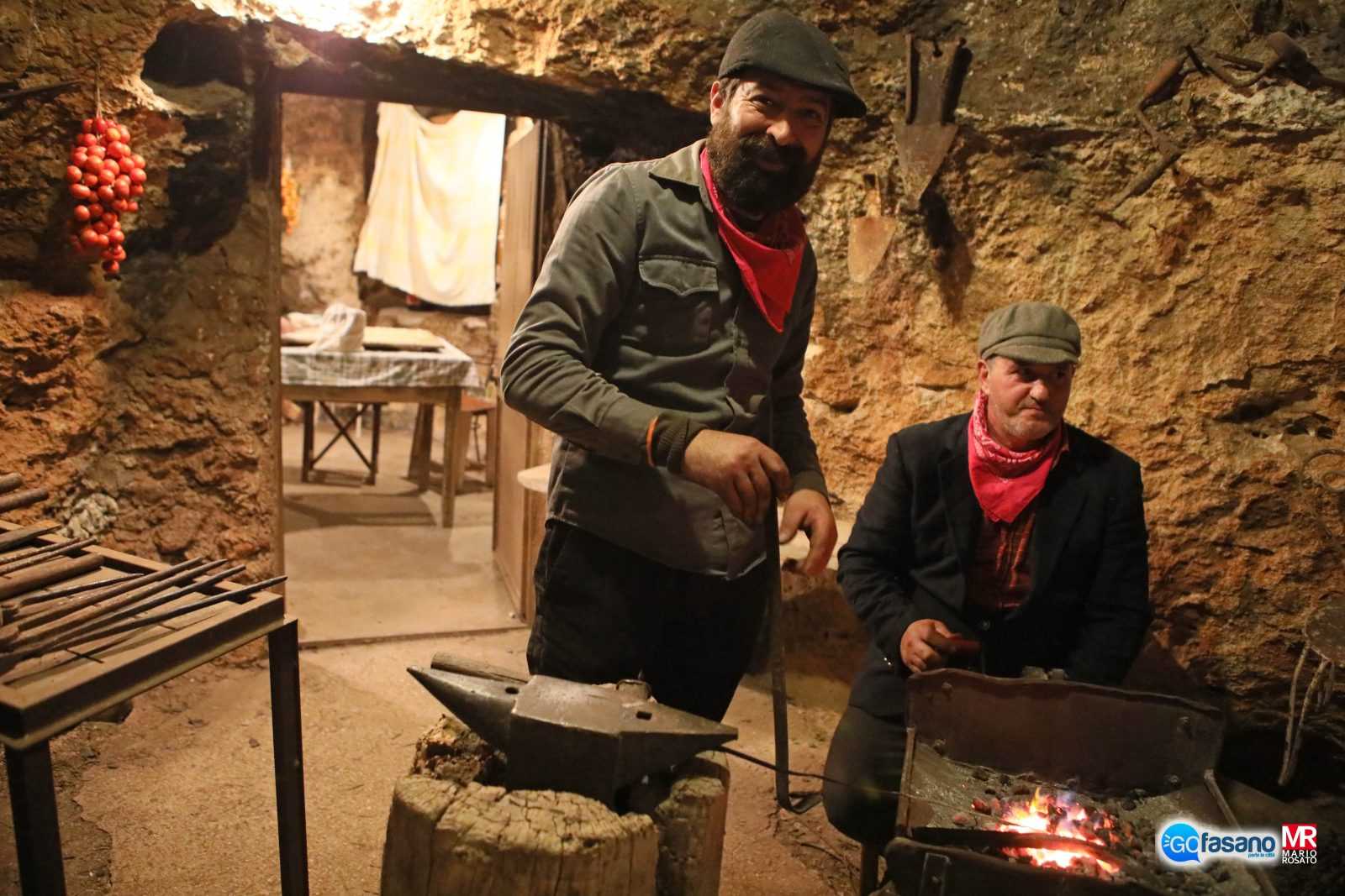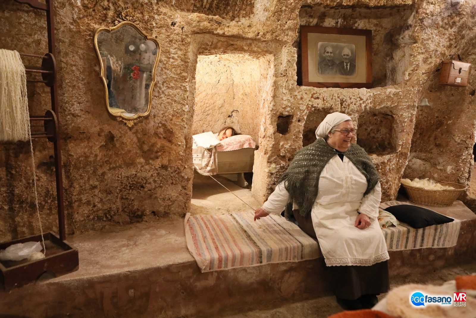 Ogni grotta corrisponde a un anfratto abitativo. In totale sono state 23 le postazioni allestite nelle varie grotte: dagli stazzi degli animali, alla nòria (che serviva per attingere acqua dalla falda sotterranea), al fabbro, al massaro, al maniscalco, alla tufaia e al bivacco dei viandanti, alla grotta dei canti e balli, a quella delle pettole, a quella dello speziale, del miele e dei dolci, al rattoppa creta, alla carbonaia, al molino con la filatura del pomodoro Regina di Torre Canne, alla grotta dei balocchi e alla taverna, all’aia, al trappeto (frantoio) ipogeo, alla bottega, al forno, alla grotta del casaro, a quella della lavorazione del cotone, della lana, al ricovero dei pastori e alla grotta del falegname e per concludere alla grotta della natività.