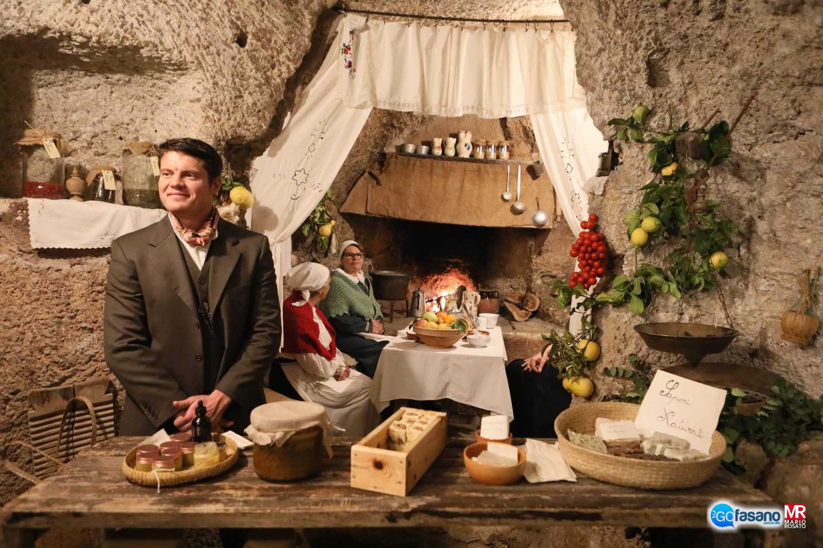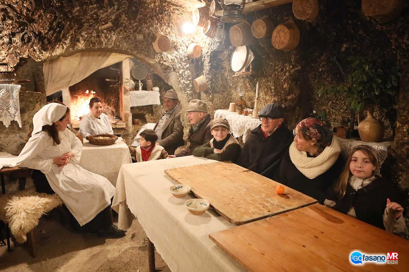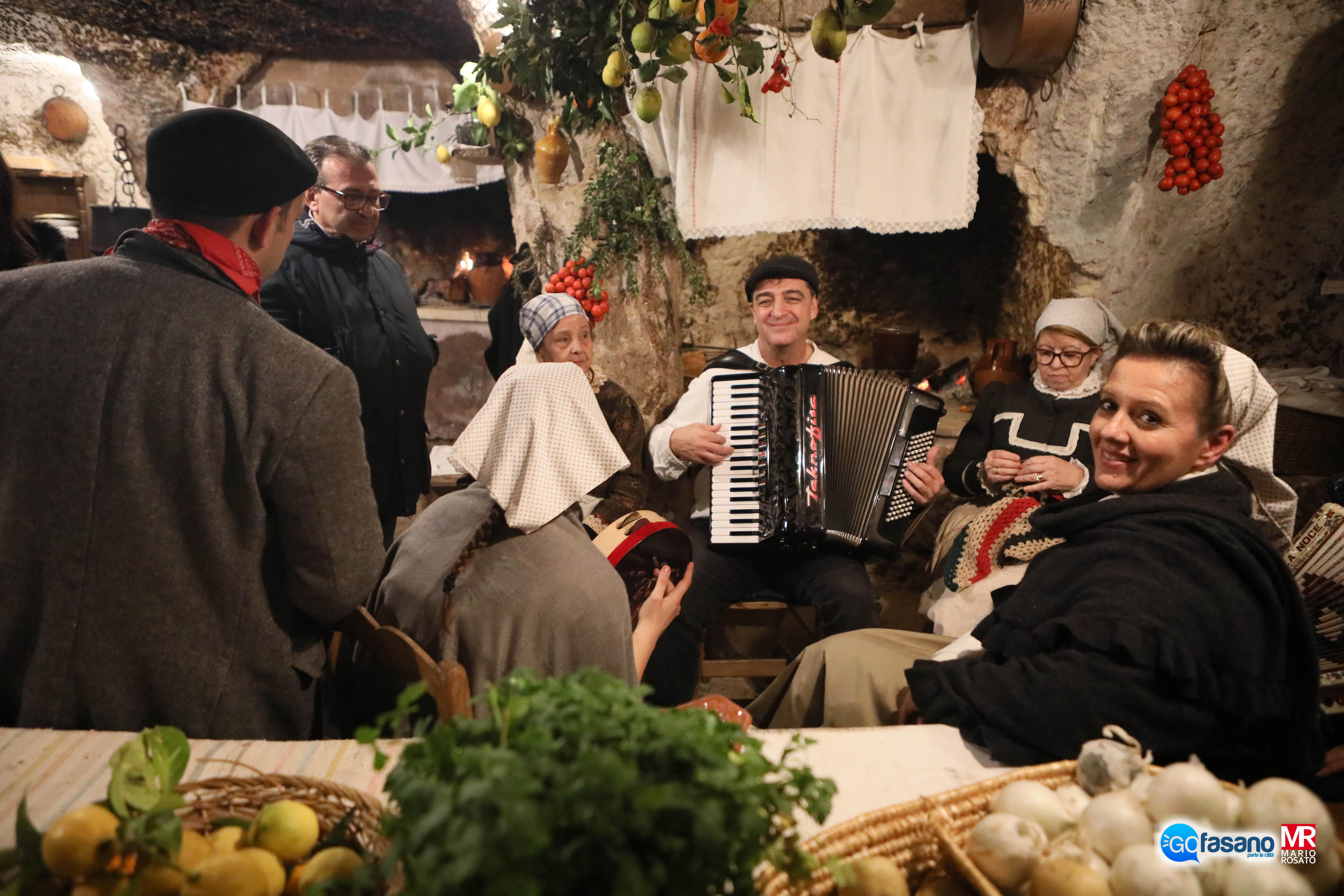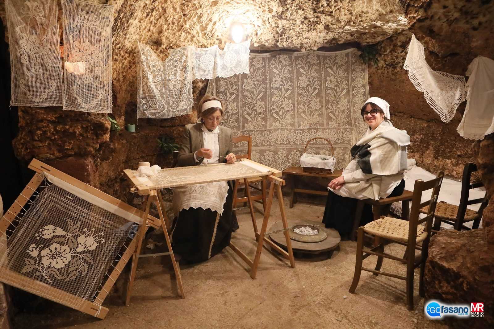 Ogni grotta corrisponde a un anfratto abitativo. In totale sono state 23 le postazioni allestite nelle varie grotte: dagli stazzi degli animali, alla nòria (che serviva per attingere acqua dalla falda sotterranea), al fabbro, al massaro, al maniscalco, alla tufaia e al bivacco dei viandanti, alla grotta dei canti e balli, a quella delle pettole, a quella dello speziale, del miele e dei dolci, al rattoppa creta, alla carbonaia, al molino con la filatura del pomodoro Regina di Torre Canne, alla grotta dei balocchi e alla taverna, all’aia, al trappeto (frantoio) ipogeo, alla bottega, al forno, alla grotta del casaro, a quella della lavorazione del cotone, della lana, al ricovero dei pastori e alla grotta del falegname e per concludere alla grotta della natività.