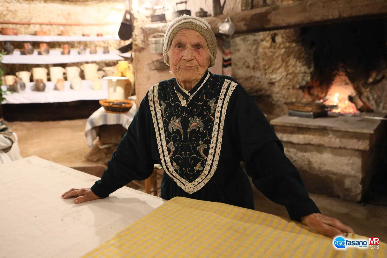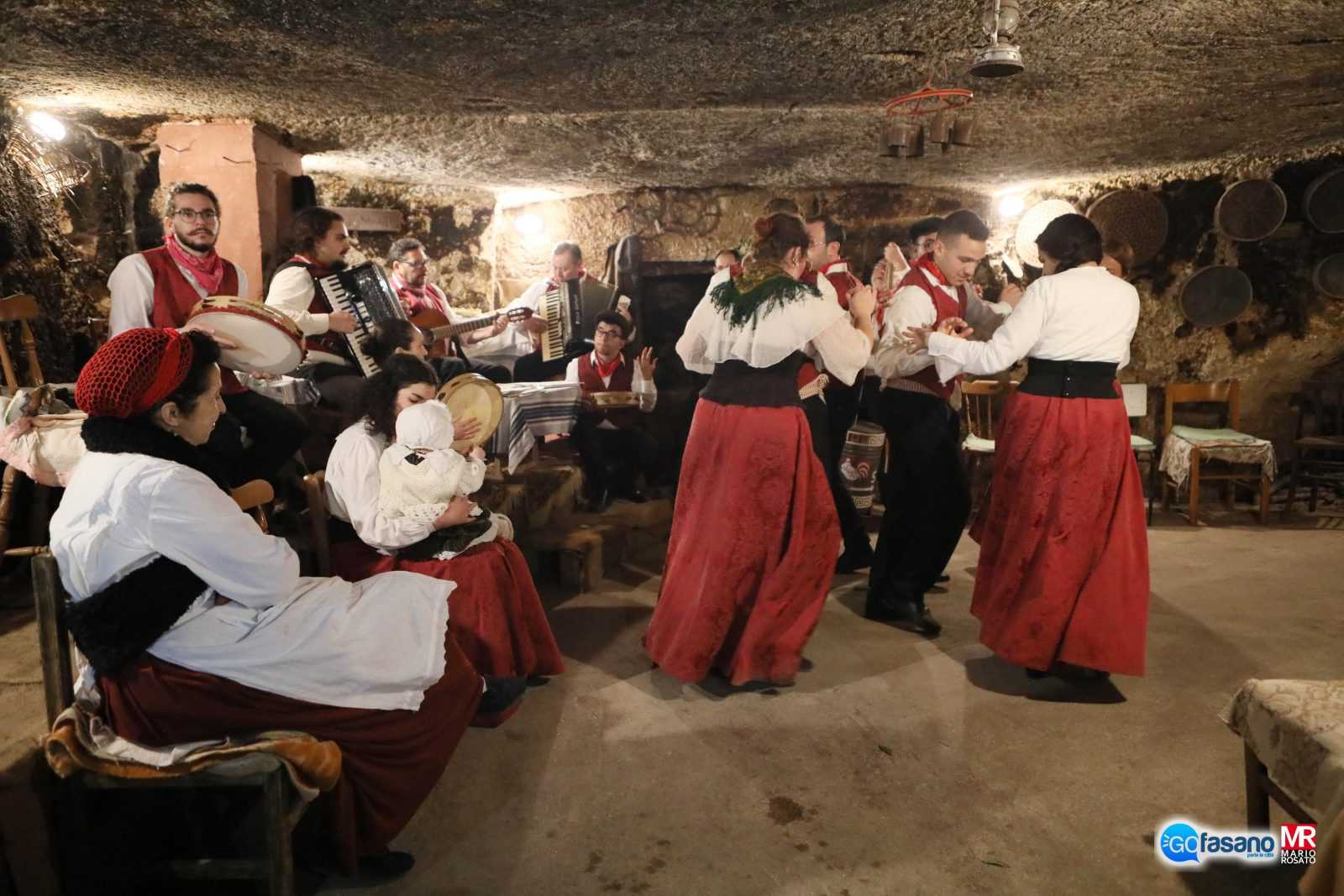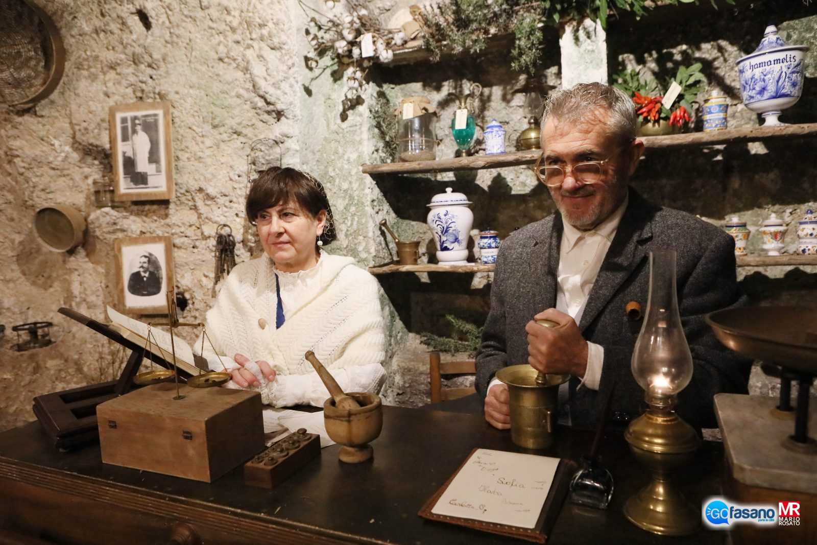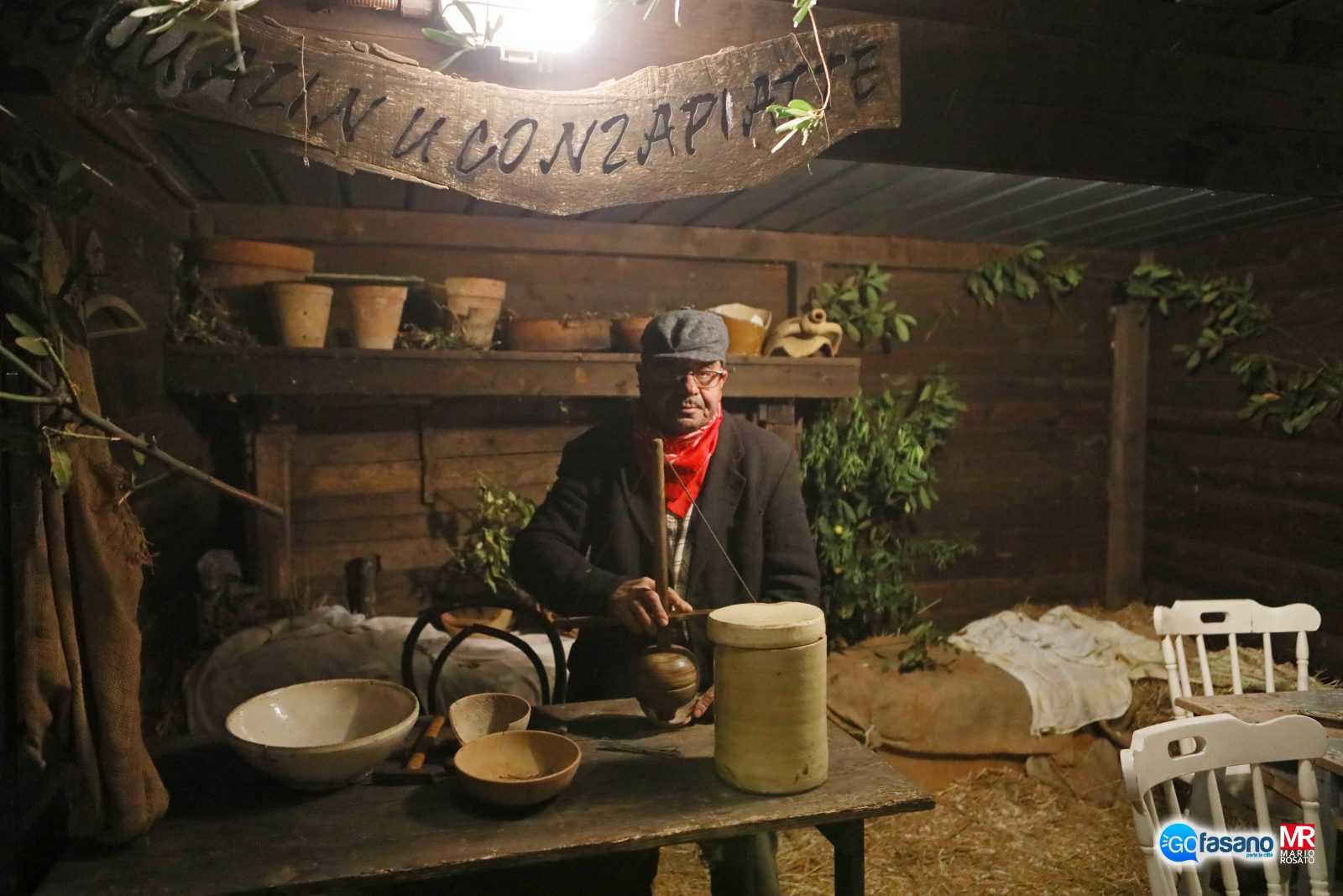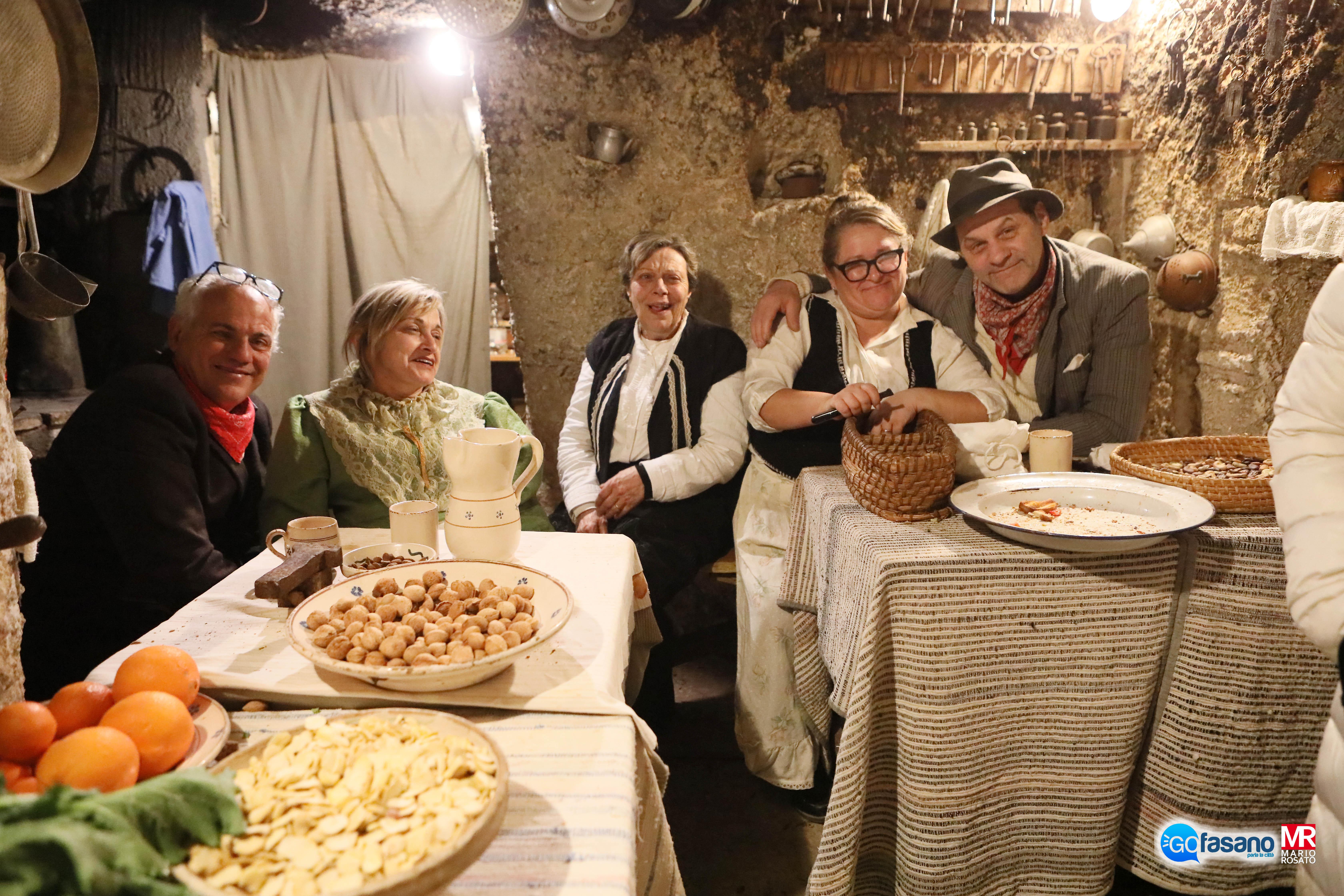 Ogni grotta corrisponde a un anfratto abitativo. In totale sono state 23 le postazioni allestite nelle varie grotte: dagli stazzi degli animali, alla nòria (che serviva per attingere acqua dalla falda sotterranea), al fabbro, al massaro, al maniscalco, alla tufaia e al bivacco dei viandanti, alla grotta dei canti e balli, a quella delle pettole, a quella dello speziale, del miele e dei dolci, al rattoppa creta, alla carbonaia, al molino con la filatura del pomodoro Regina di Torre Canne, alla grotta dei balocchi e alla taverna, all’aia, al trappeto (frantoio) ipogeo, alla bottega, al forno, alla grotta del casaro, a quella della lavorazione del cotone, della lana, al ricovero dei pastori e alla grotta del falegname e per concludere alla grotta della natività.