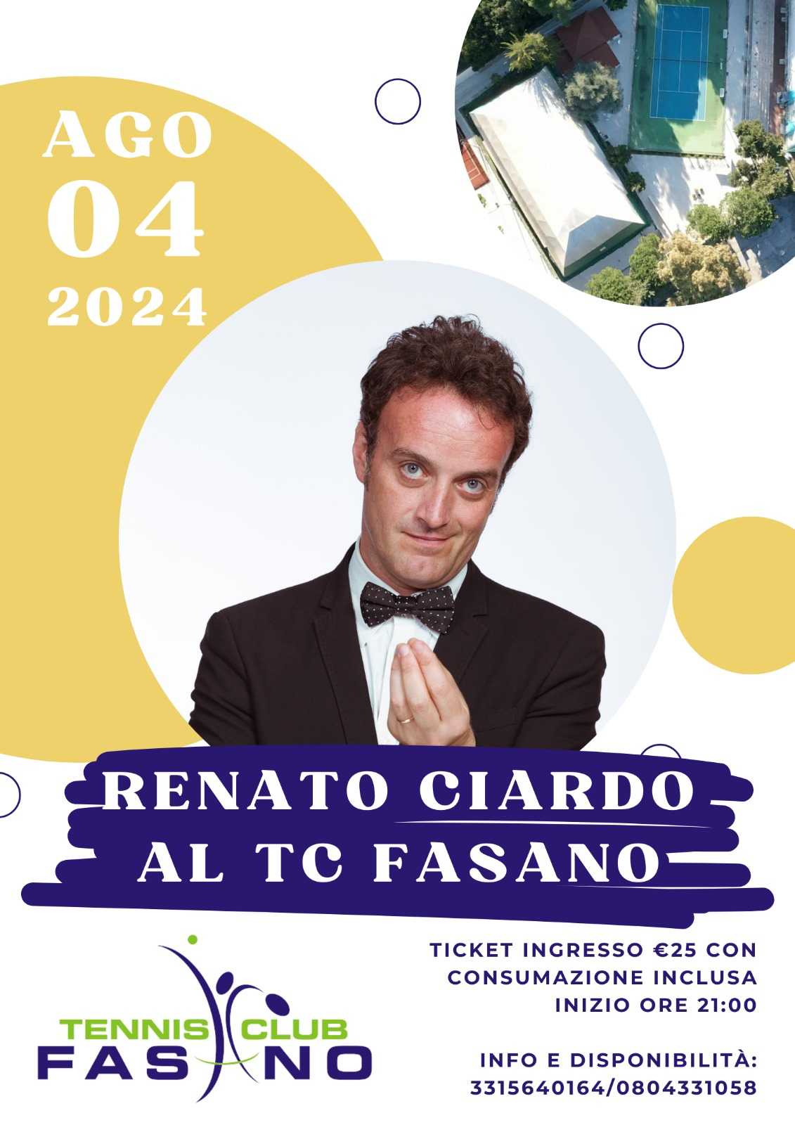 FASANO – Domenica 4 agosto il Tennis Club Fasano ospiterà lo spettacolo dell’attore comico e musicista Renato Ciardo.