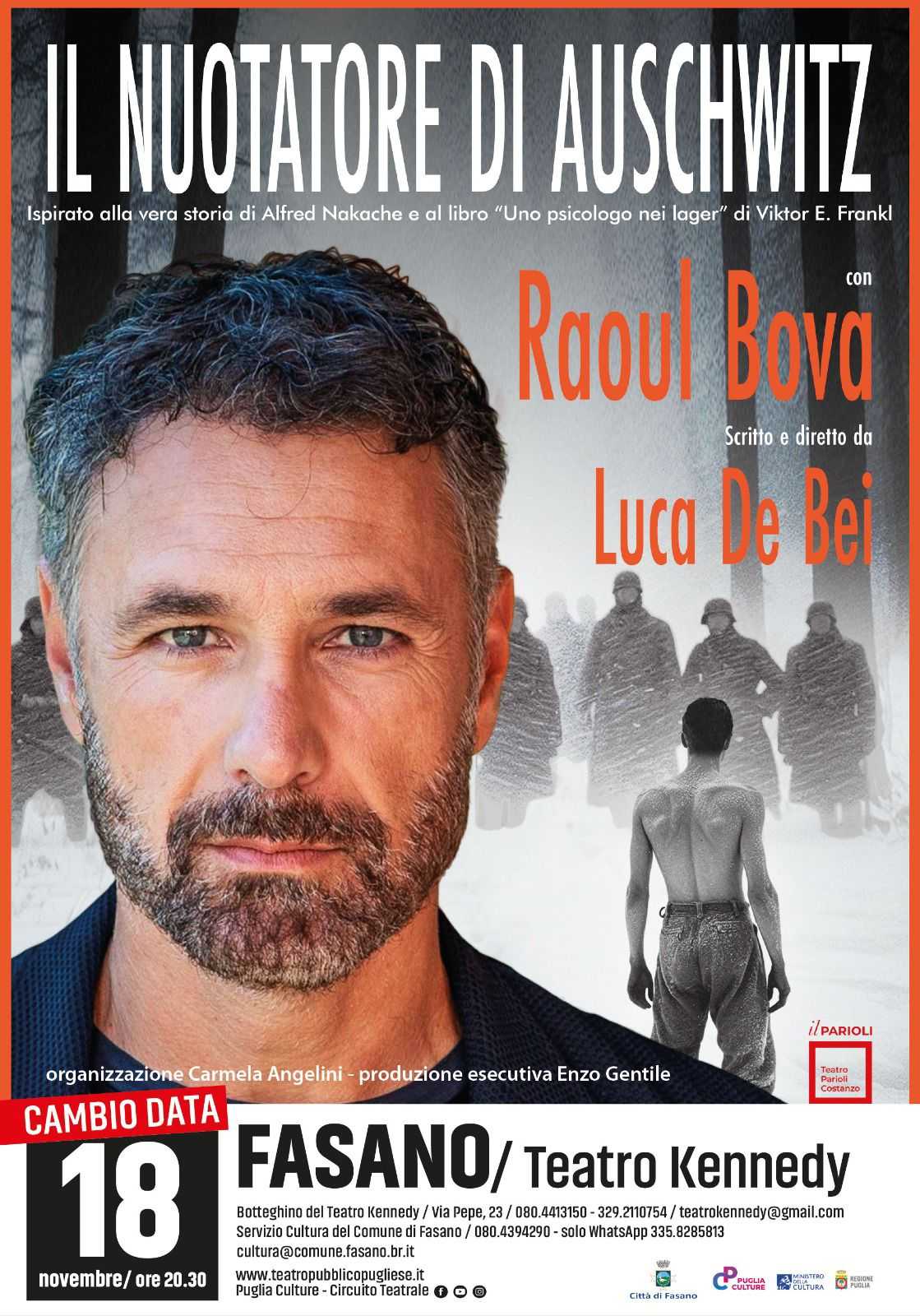 FASANO – Il Comune di Fasano e il Teatro Pubblico Pugliese informano che lo spettacolo con Raoul Bova, Il nuotatore di Auschwitz (produzione Enfi teatro) per la regia di Luca De Bei, in programma originariamente il prossimo 12 novembre 2024 al Teatro JF Kennedy come spettacolo inaugurale della Rassegna di Prosa comunale 2024-25, per cause indipendenti dall’Amministrazione comunale, sarà posticipato al 18 novembre 2024.