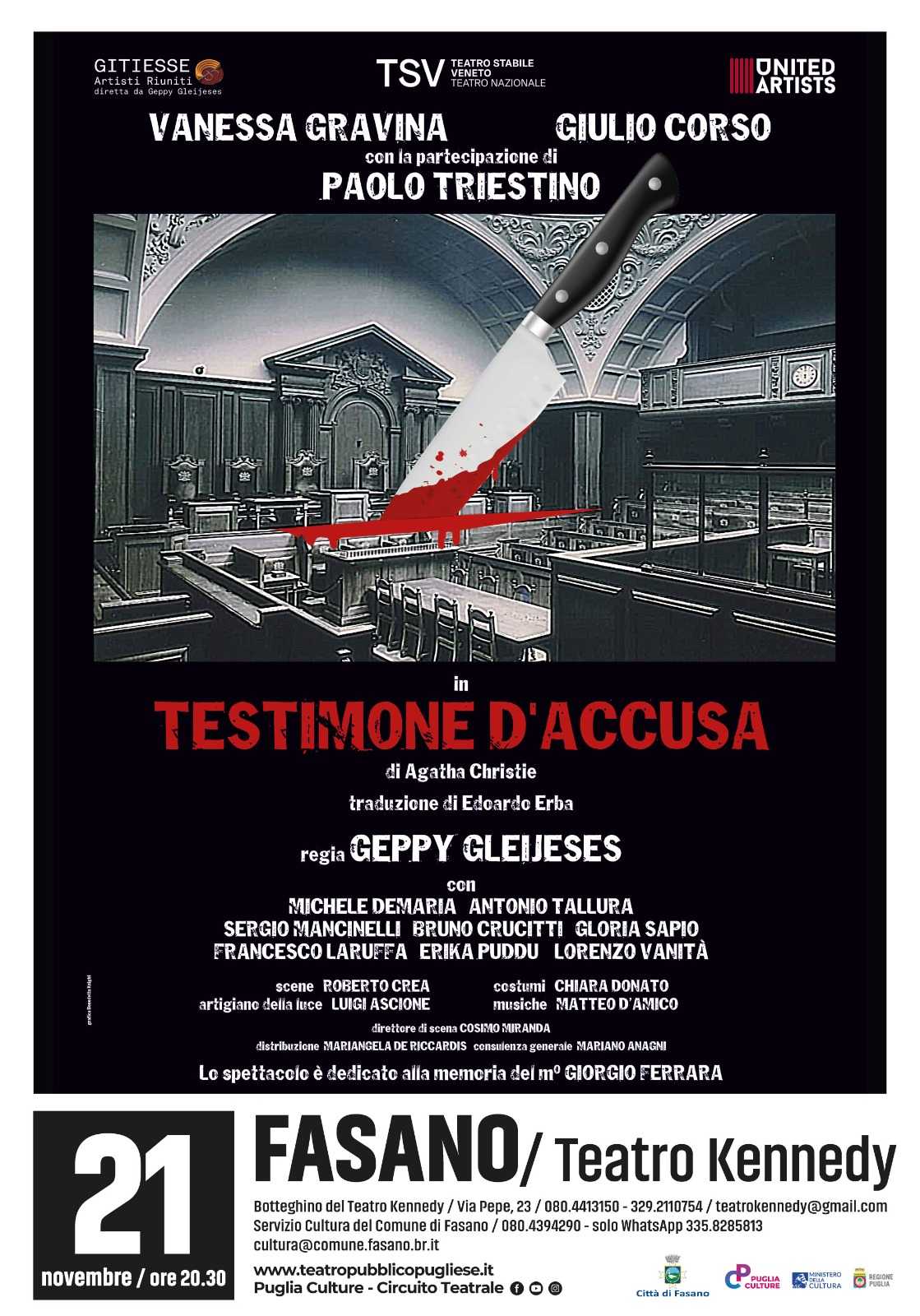 Si ricorda inoltre, sempre nell’ambito della stagione di prosa del Comune di Fasano, l’appuntamento del 21 novembre con Vanessa Gravina, Giulio Corso con la partecipazione di Paolo Triestino nel giallo di Agatha Christie Testimone d’accusa, tra i più bei drammi giudiziari dell’autrice, qui con la regia di Geppy Gleijeses, sempre al Teatro Kennedy.