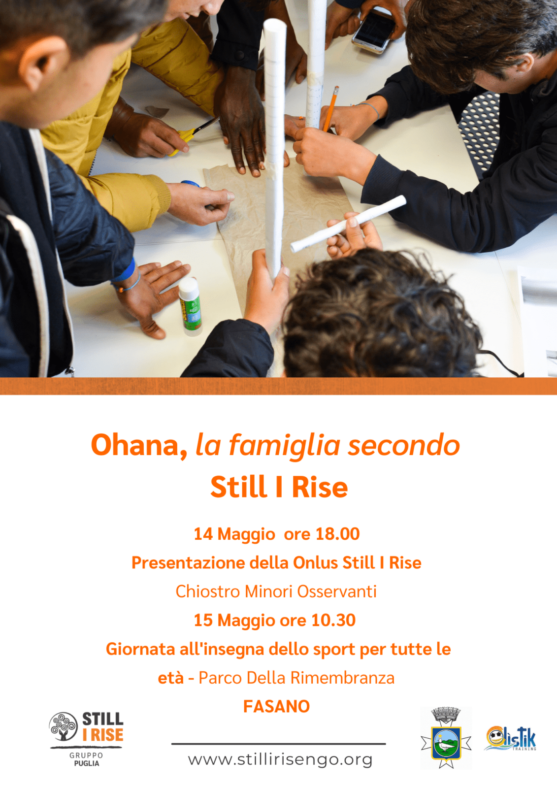 FASANO – In occasione del Maggio dell’Infanzia si prepara a Fasano un fine settimana con “Still I Rise”, organizzazione non profit indipendente nata per offrire istruzione e protezione ai minori profughi e vulnerabili. Sabato 14 maggio alle ore 18, presso il Chiostro dei Minori Osservanti in Corso V. Emanuele II, i volontari del gruppo territoriale Puglia di Still I Rise presenteranno l’organizzazione e la sua missione, avvalendosi anche di proiezione di video e di un punto informativo con brochure e gadgets. Domenica 15 maggio, invece, in occasione della ricorrenza della Giornata della Famiglia, sarà organizzata una mattinata interamente dedicata ai bambini e ai ragazzi, con giochi e attività ludico-sportive presso il Parco della Rimembranza dalle 10.30 in poi. Le attività sono organizzate con il patrocinio del Comune di Fasano e la collaborazione dell’Associazione sportiva Olistik Training.