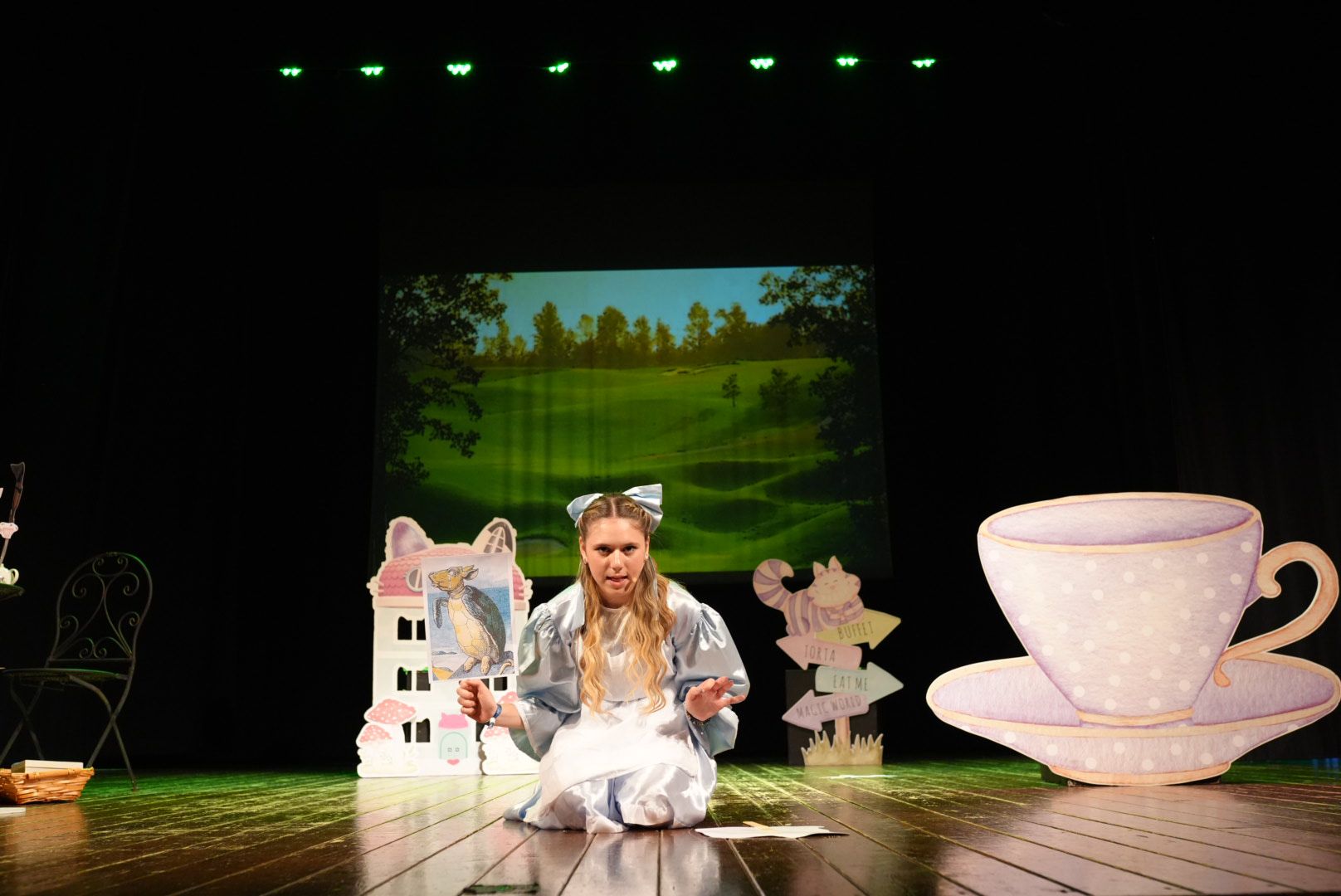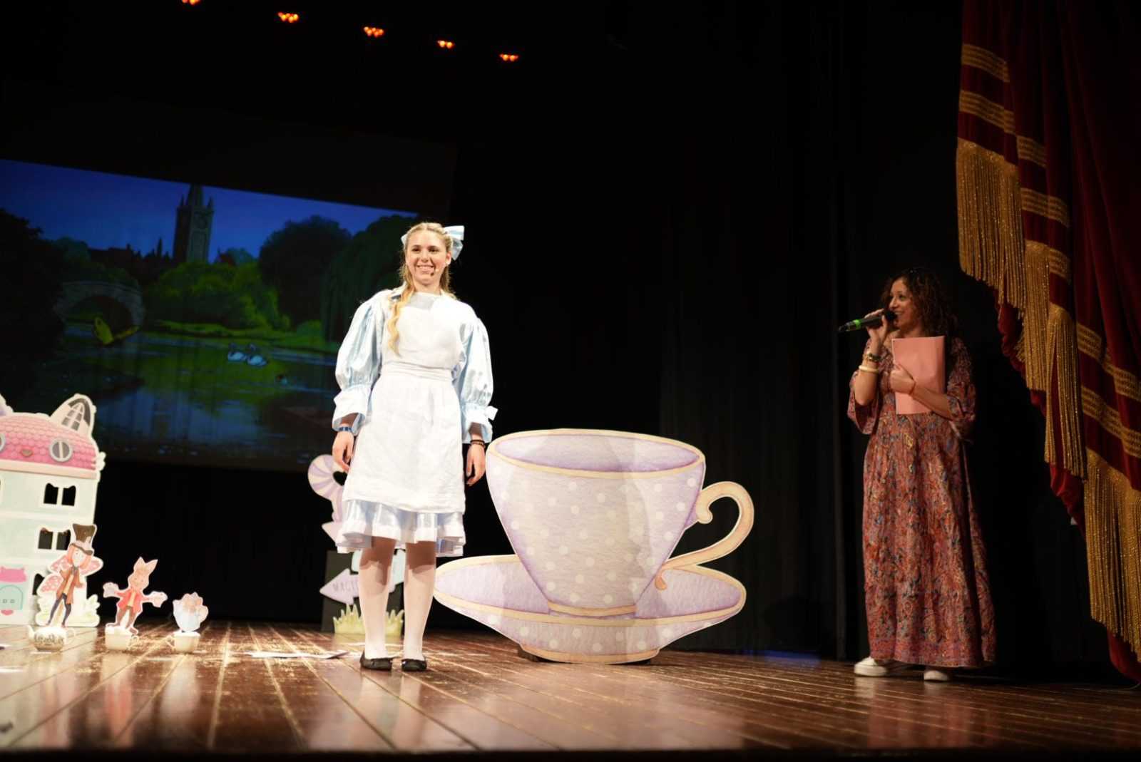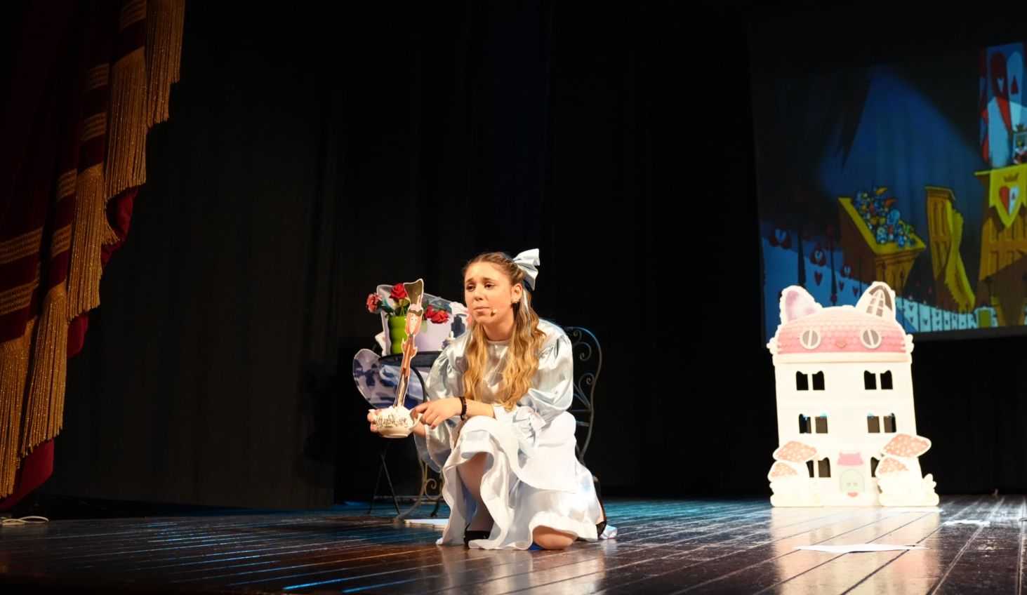 Fra la profonda tana del Bianconiglio, le stranezze dello Stregatto e la pazzia della Regina di Cuori, i piccoli spettatori hanno assistito a uno spettacolo pieno di colori: prezioso l’allestimento scenico curato da Mara Laguardia e gli sfondi di Gabriella Cavallo.