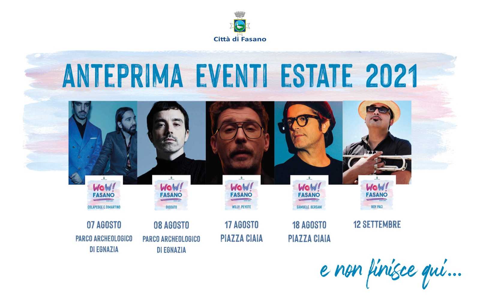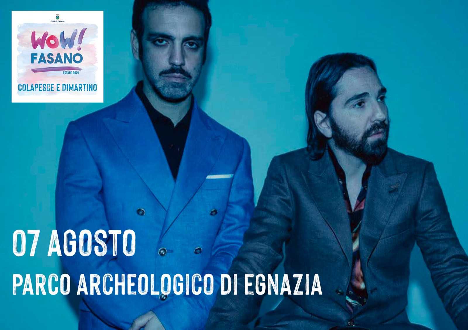 Il cartellone completo, rientrante tra le iniziative del format «Wow! Fasano» sarà svelato a fine mese, ma intanto sono già stati ufficializzati i primi appuntamenti. Il 7 agosto a Fasano ci saranno Colapesce e Dimartino che, dopo il successo sul palco dell’Ariston, spopolano da due mesi in radio con «Musica leggerissima». Il giorno dopo, l’8 agosto, sarà la volta di Diodato, che l’anno scorso ha vinto il Festival di Sanremo con «Fai Rumore» e di cui proprio ieri è uscito il brano «L’uomo dietro il campione», canzone principale del film su Roberto Baggio «II Divin codino».