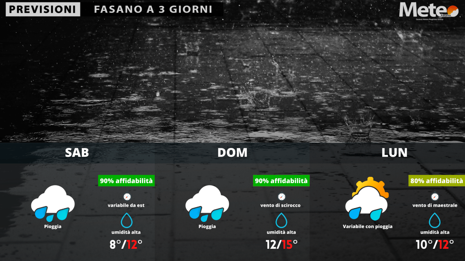 Le previsioni dei prossimi giorni vedono dunque nuvole e pioggia a Fasano, con temperature in lieve aumento e valori compresi fra 12 e 15°C nella giornata di domani a causa dei miti venti meridionali. In particolare si prevedono piogge nel pomeriggio-sera di oggi e per buona parte della giornata di domani, con pause piovose a metà giornata.
