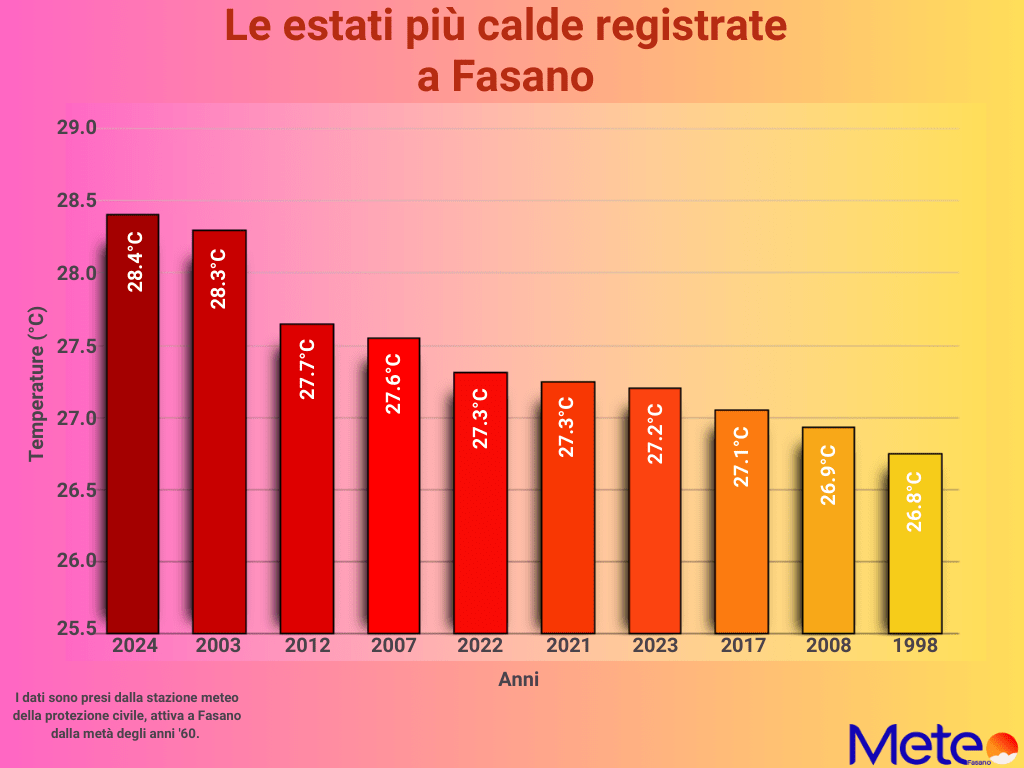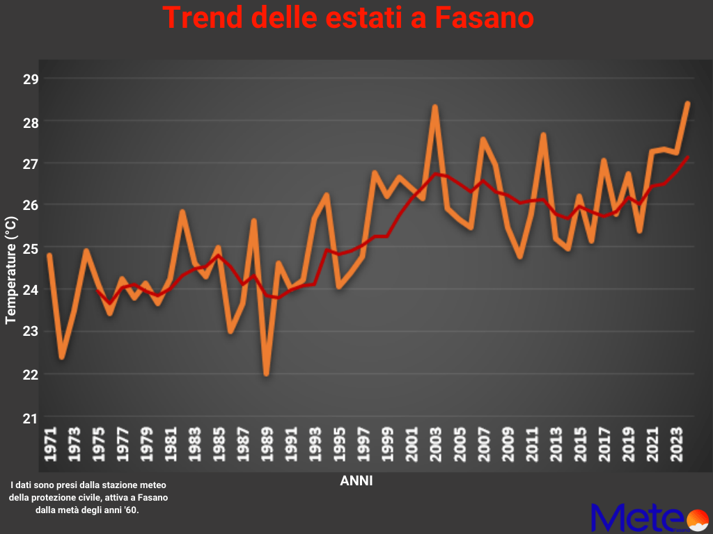 FASANO – Nella giornata di oggi giungerà al capolinea l’estate 2024 che a Fasano, con una temperatura media di 28.4°C (dati fra il 1° giugno e il 31 agosto), scavalca di un decimo l’estate 2003, diventando dunque la più calda registrata nella nostra città. Una lunghissima sequenza di giorni caldi che ieri ci ha regalato gli ultimi 30 gradi della stagione in città, senza dimenticare le notti caldissime dove la temperatura non è mai scesa al di sotto dei 25°C. Valori fortemente anomali, segno di un clima ormai cambiato, come dimostra il trend delle temperature estive negli ultimi decenni.
