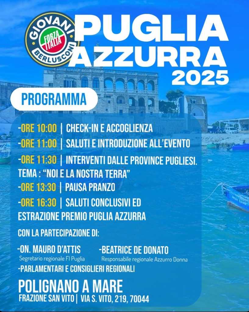 “L’evento di sabato – comunica il segretario – rappresenterà un’occasione per celebrare gli importanti risultati ottenuti da Forza Italia Giovani in Puglia, con la partecipazione di più di 100 ragazzi da tutta la regione, oltre alla presenza della classe dirigente e parlamentare di Forza Italia.”