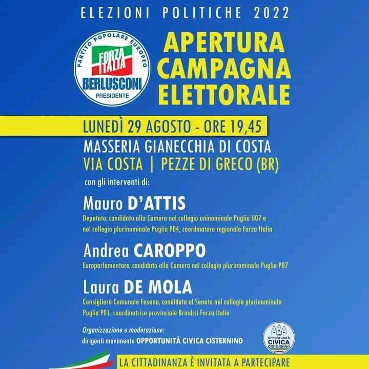 Si terrà stasera, alle ore 19.45, a Masseria Gianecchia di Costa a Pezze di Greco, l’appuntamento con gli esponenti pugliesi di Forza Italia. Interveranno: Mauro D’Attis, deputato e candidato alla Camera nel collegio uninominale Puglia 007 e nel collegio plurinominale Puglia PO4, oltre che coordinatore regionale di Forza Italia; Andrea Caroppo, europarlamentare, candidato allo Camera nel collegio plurinominale Puglia P07; la consigliera comunale fasanese Laura De Mola, candidata al Senato nel collegio plurinominale Puglia P01, e coordinatrice provinciale di Forza Italia.