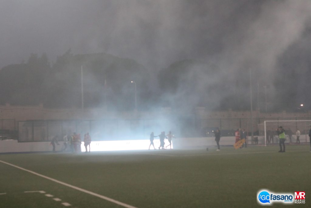 “Euro 3.200,00 CITTÀ DI FASANO, Per avere, persone non identificate, ma chiaramente riconducibili alla società, fatto indebito ingresso sul terreno di gioco e spintonato nell’occasione in modo aggressivo i calciatori avversari, determinando un principio di rissa. Inoltre, per avere propri sostenitori lanciato all’indirizzo di un A.A. numerosi sputi (più di venti) e alcuni tappi di fumogeni (circa 7) che lo colpivano alla schiena, nonché bottigliette e bicchieri di carta”.