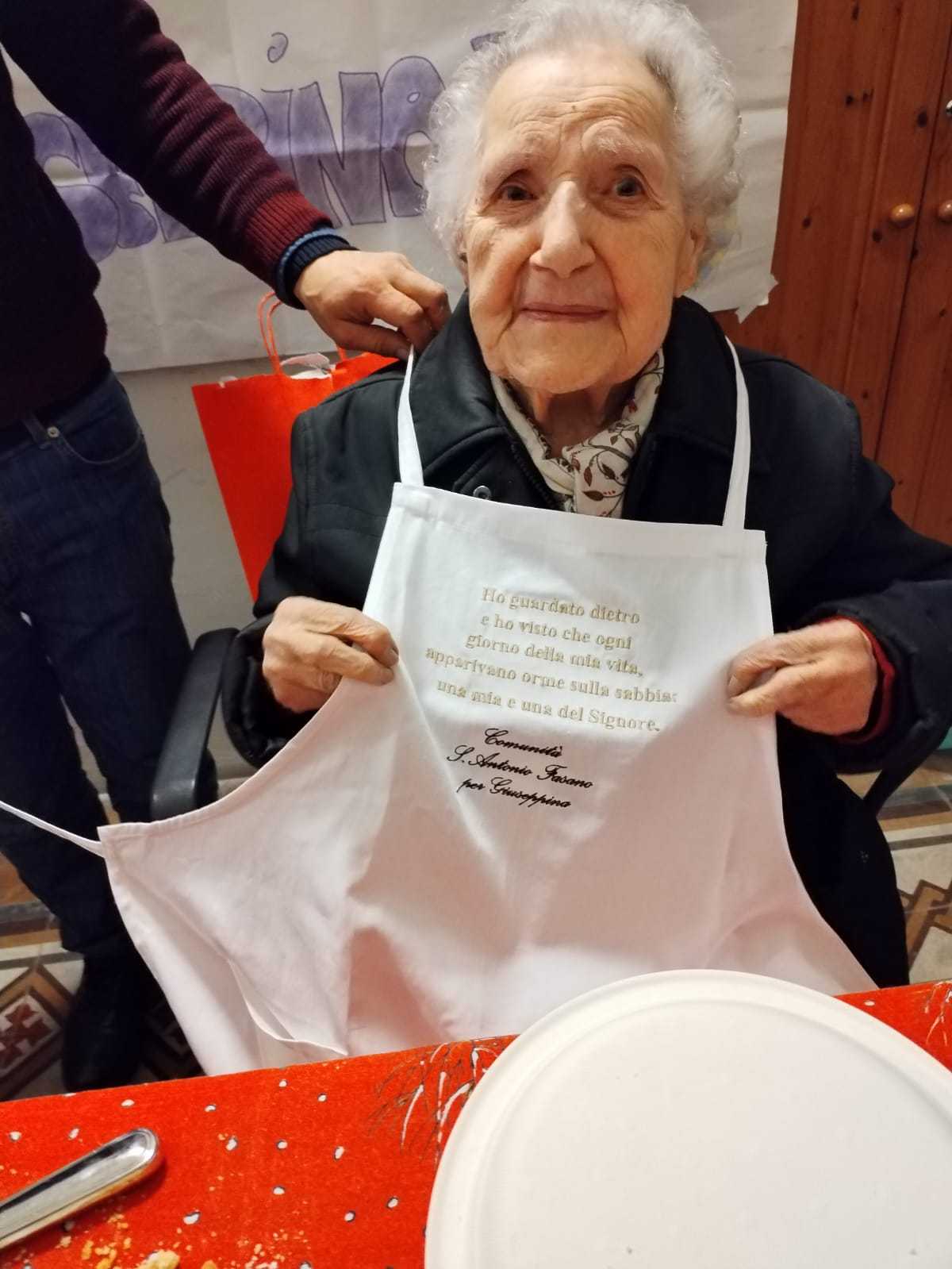 Torta, candeline e regali per la centenaria, tra cui un bellissimo grembiule da cucina dagli amici della parrocchia, con una citazione ricamata: “Ho guardato dietro e ho visto che ogni giorno della mia vita, apparivano orme sulla sabbia: una mia e una del Signore”.