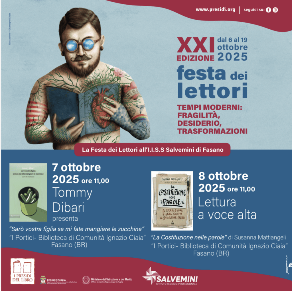 FASANO – Come ogni anno, torna la Festa dei lettori promossa dall’Associazione “Presìdi del Libro”, realizzata con il sostegno della Regione Puglia e il patrocinio dell’Ufficio Scolastico Regionale, per la promozione della lettura.