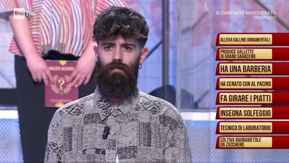 Con i suoi 26 anni e la sua inconfondibile lunga barba, Lorenzo si è presentato al cospetto del conduttore Amadeus e del concorrente del giorno, l’attore Paolo Calabresi, che doveva indovinare la professione del ragazzo.