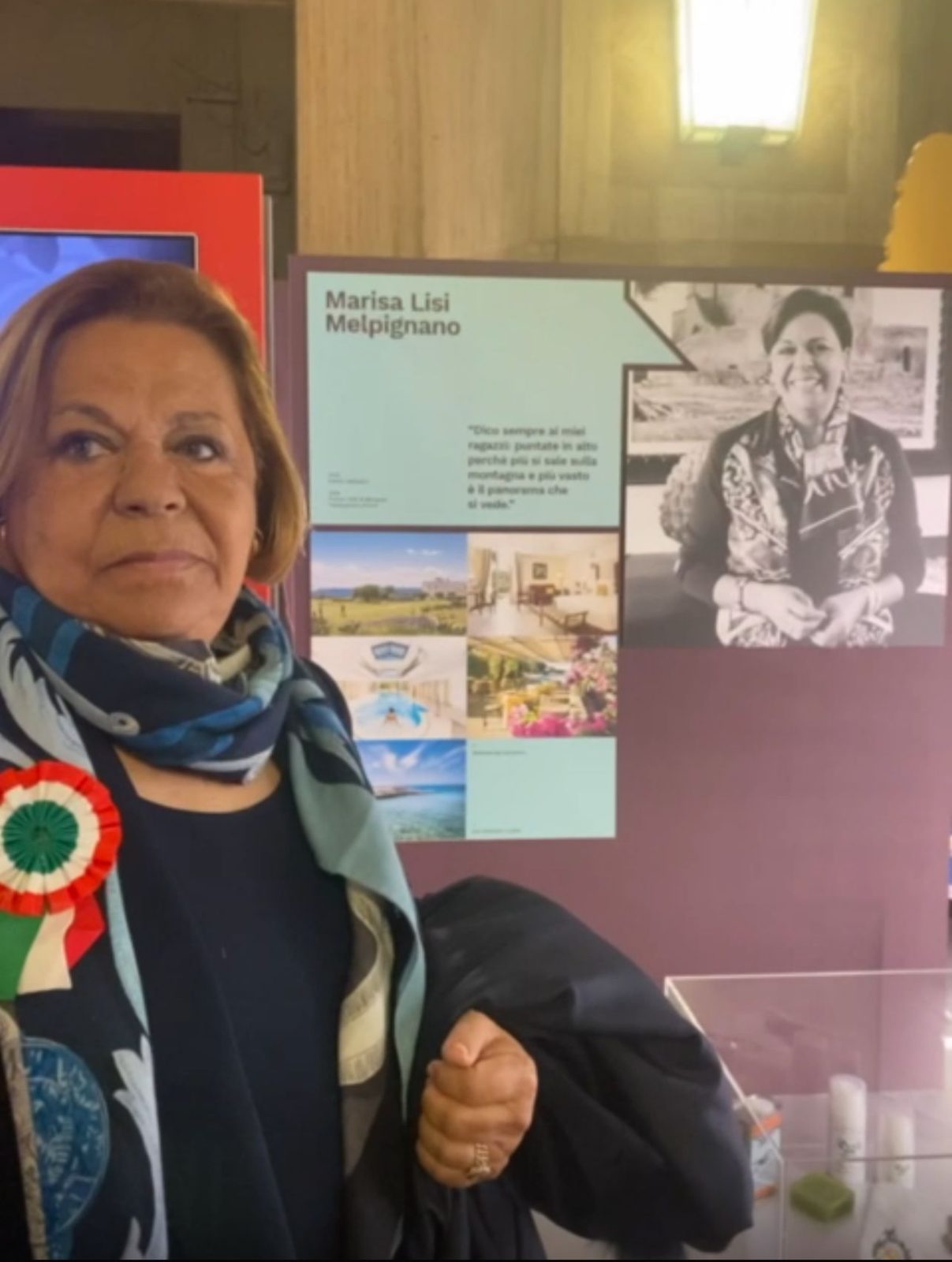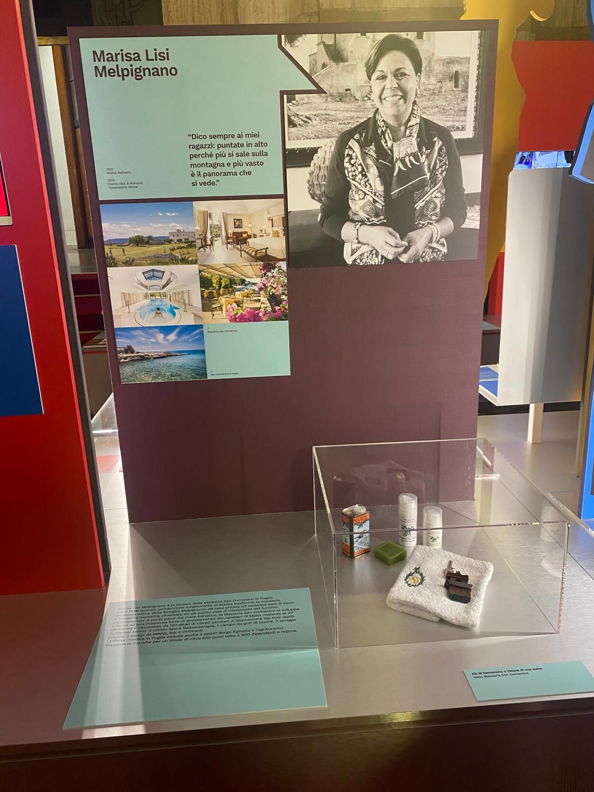 Una delle figure di spicco raccontate dalla mostra è l’imprenditrice fasanese Marisa Lisi Melpignano. La sua storia è emblematica della capacità tutta femminile di coniugare visione imprenditoriale e sensibilità culturale. Una donna visionaria che decise di trasformare l’antica Masseria San Domenico, fino ad allora residenza privata, in un raffinato resort di lusso, perfettamente integrato nel paesaggio e nelle tradizioni locali. Quel progetto, nato da un’intuizione audace, diventa un modello di ospitalità di successo e dà vita a un piccolo impero del turismo di charme, che include realtà iconiche come Borgo Egnazia – scelto da star internazionali e protagonisti del jet set – e Masseria Le Carrube, luogo dedicato al benessere e alla cucina vegetariana d’eccellenza. Marisa ha fatto della qualità, dell’autenticità e della cura per i dettagli la cifra del suo lavoro, ispirando intere generazioni di imprenditori e professionisti. La sua citazione riportata nella mostra racchiude il senso profondo del suo approccio: “Dico sempre ai miei ragazzi: puntate in alto, perché più si sale sulla montagna e più vasto è il panorama che si vede.”