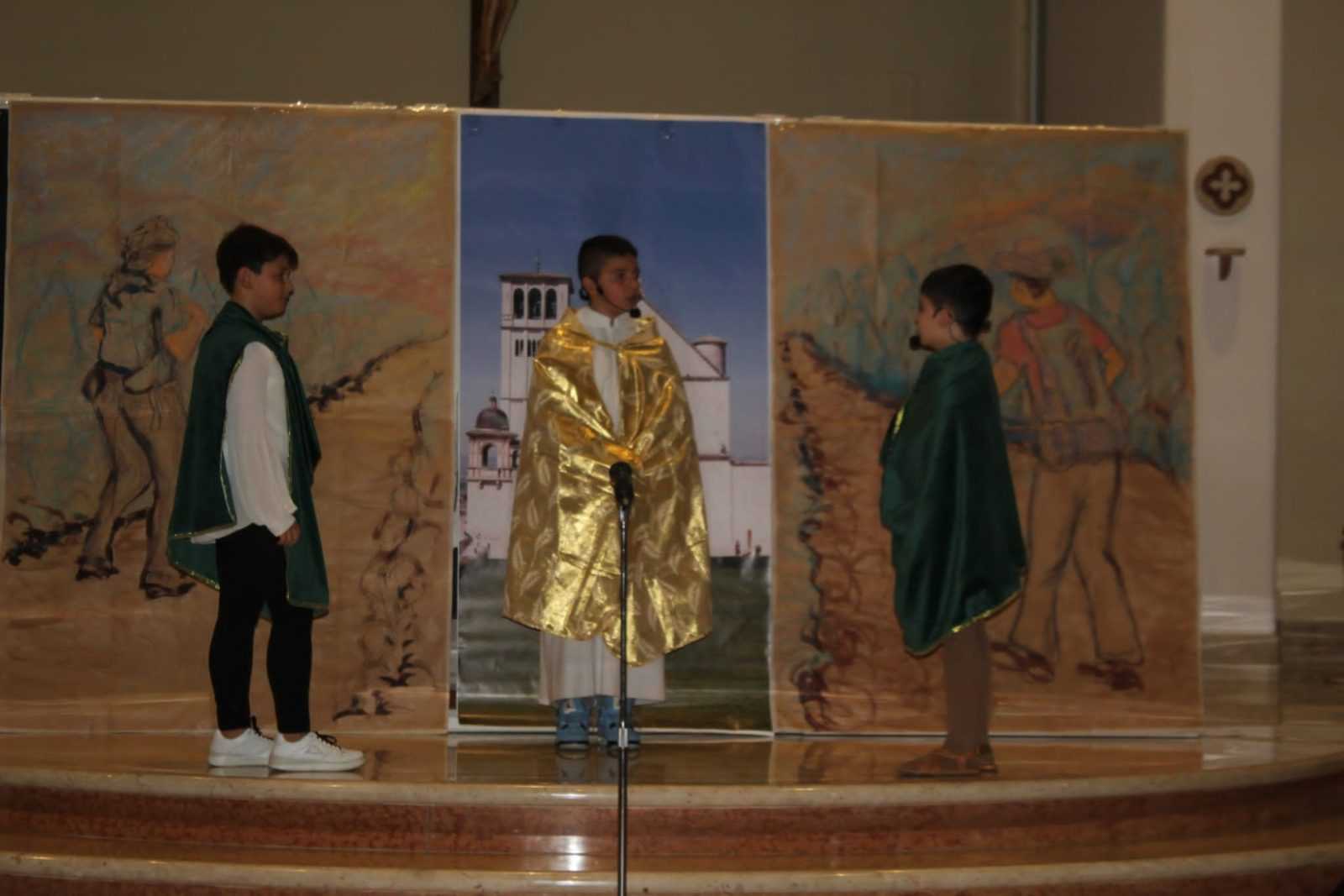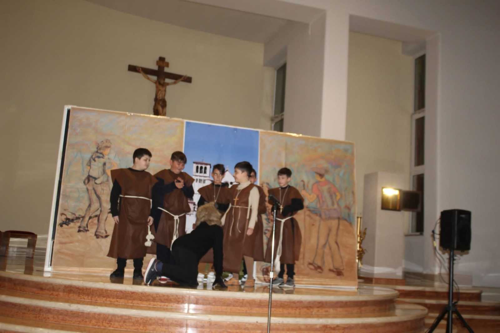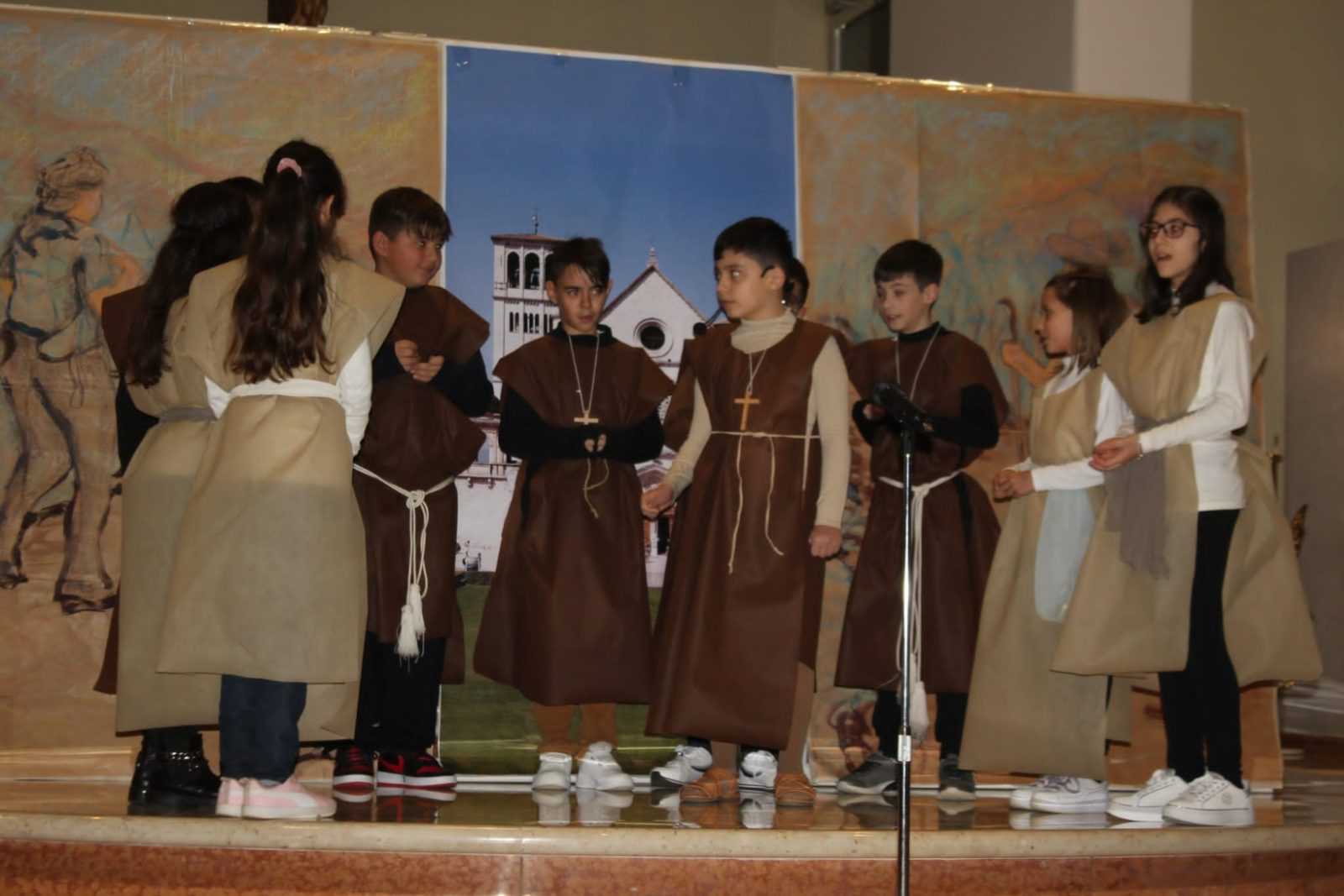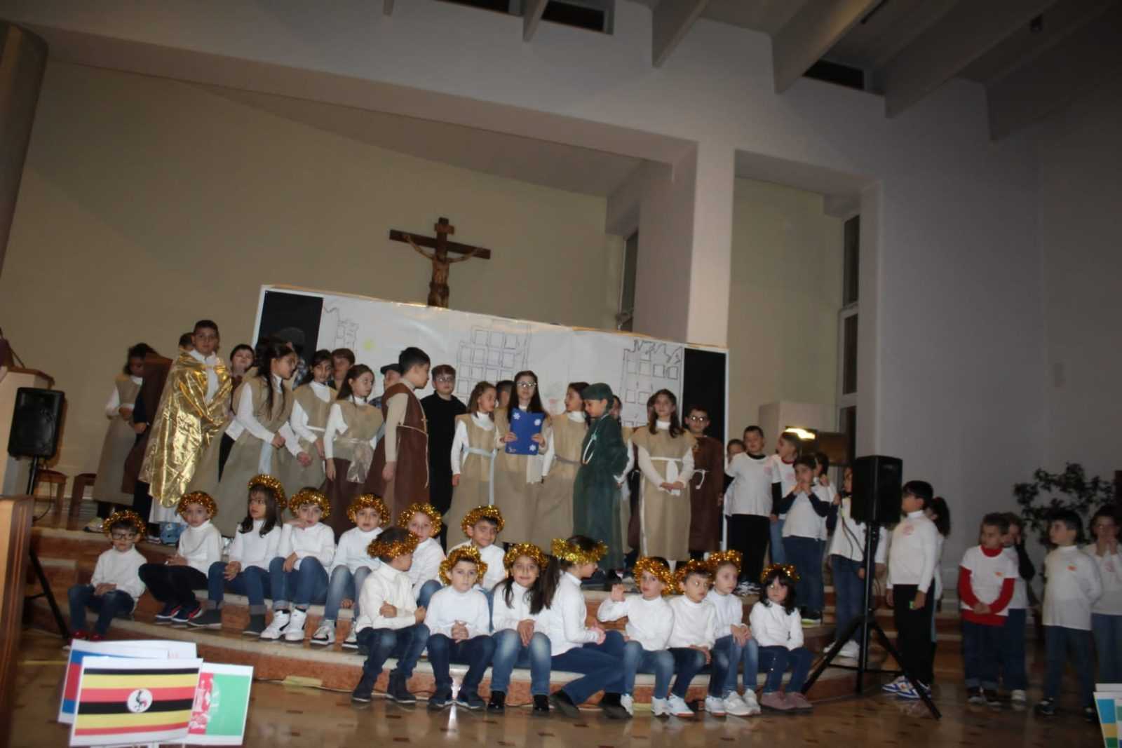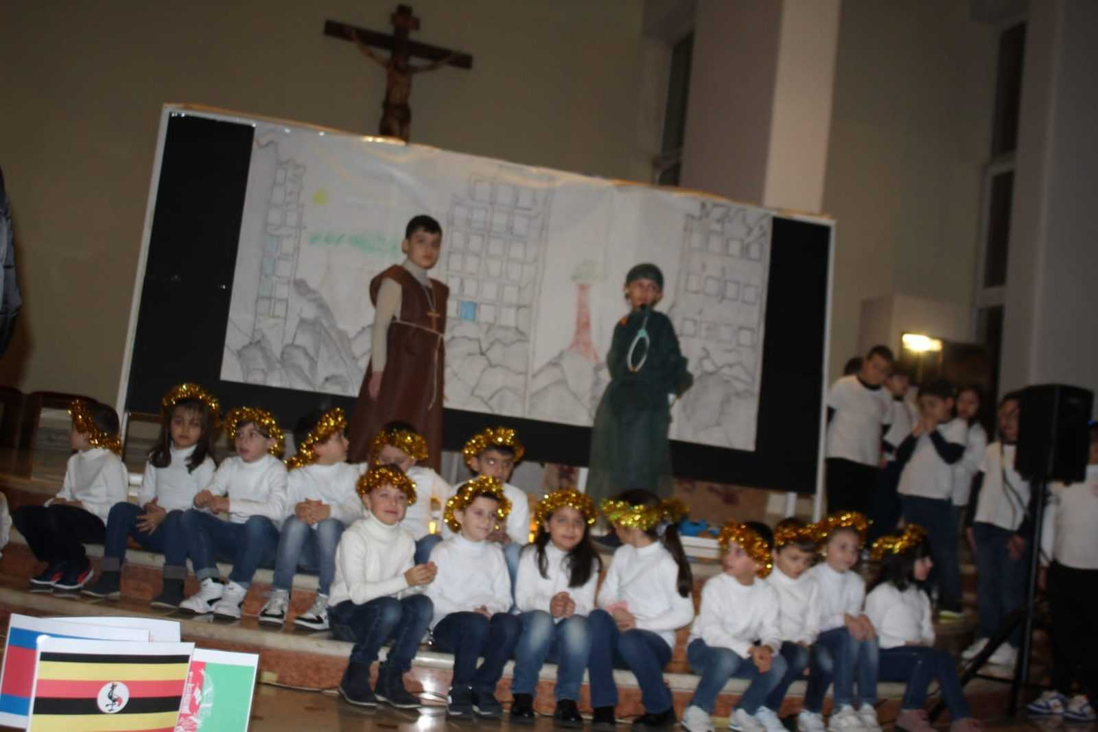 Le classi quarte e quinta hanno rappresentato alcuni episodi fondamentali della vita di San Francesco con scenette e canti. Le classi seconda e terza hanno raccontato, attraverso un dialogo immaginario con Gino Strada, la sua vita e l’operato dell’associazione Emergency a favore della Pace nel mondo. I bambini della classe prima hanno deposto il piccolo Gesù Bambino ai piedi dei due operatori di Pace, dopo un’emozionante e suggestivo corteo con i lumini.