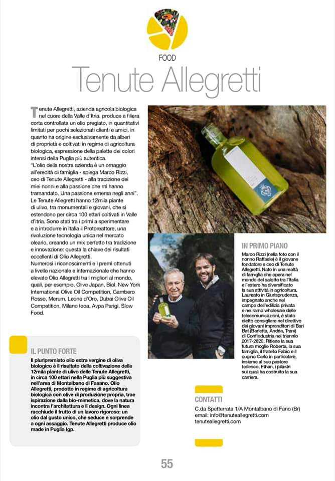 Sfogliando l’inserto del mese di febbraio, ci si imbatte in una pagina dedicata ad un’eccellenza nostrana, più precisamente all’azienda montalbanese Tenute Allegretti. Il punto forte, come lo definisce Forbes, è “il pluripremiato olio extra vergine di oliva biologico, risultato della coltivazione delle 12mila piante di ulivo delle Tenute Allegretti, in circa 100 ettari nella Puglia più suggestiva nell’area di Montalbano di Fasano. Olio Allegretti, prodotto in regime di agricoltura biologica con olive di produzione propria, trae ispirazione dalla bio-mimetica, dove la natura incontra l’architettura e il design. Ogni linea racchiude il frutto di un lavoro rigoroso: un olio dal gusto unico, che seduce e sorprende a ogni assaggio. Tenute Allegretti produce olio made in Puglia Igp”.
