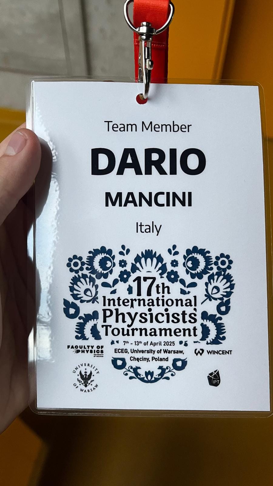 FASANO – Dario Mancini, giovane studente fasanese di Ingegneria Fisica al Politecnico di Milano, ha recentemente rappresentato l’Italia alle Olimpiadi Internazionali di Fisica (IPT – International Physicists’ Tournament), che si sono svolte dal 6 al 13 aprile 2025 a Varsavia, in Polonia, presso il centro di ricerca ECEG.