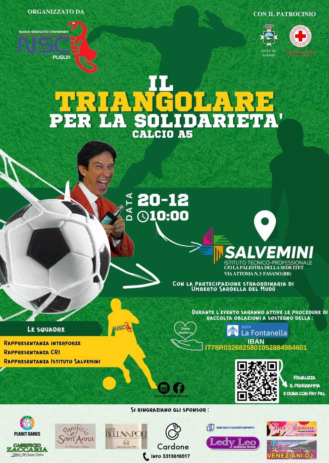 Il giorno 20 dicembre è una data importante, poichè si terrà un evento che propone un triangolare di calcio a 5 presso l’Istituto Tecnico Salvemini di Fasano preceduto da una esibizione dellattore comico pugliese Umberto Sardella dei Mudù. Sarà questa una buona occasione di promuovere un’azione benefica in supporto di chi ne ha più bisogno.