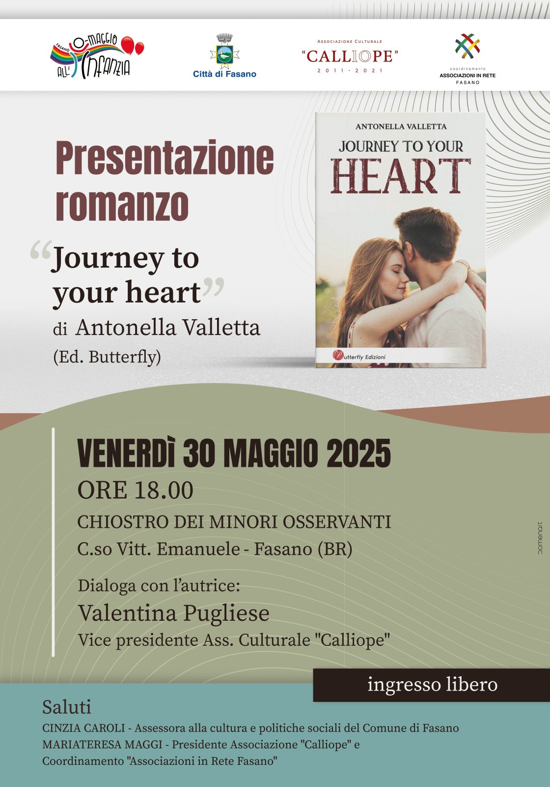 Venerdì 30 maggio 2025 alle ore 18.00 presso il Chiostro dei Minori Osservanti- Fasano Presentazione del romanzo “Journey to your heart” di Antonella Valletta. Dialogherà con l’autrice Valentina Pugliese- vice presidente Associazione Culturale “Calliope”