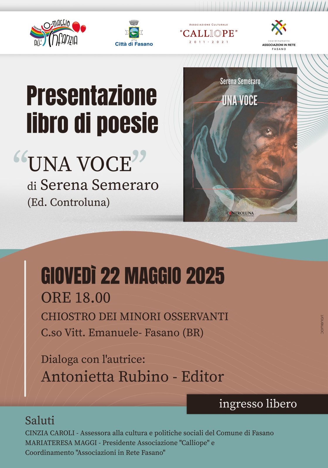 Giovedì 22 maggio 2025 alle ore 18.00 presso il Chiostro dei Minori Osservanti – Fasano Presentazione del libro di poesie “Una voce” di Serena Semeraro. Dialogherà con l’autrice Antonella Rubino-Editor