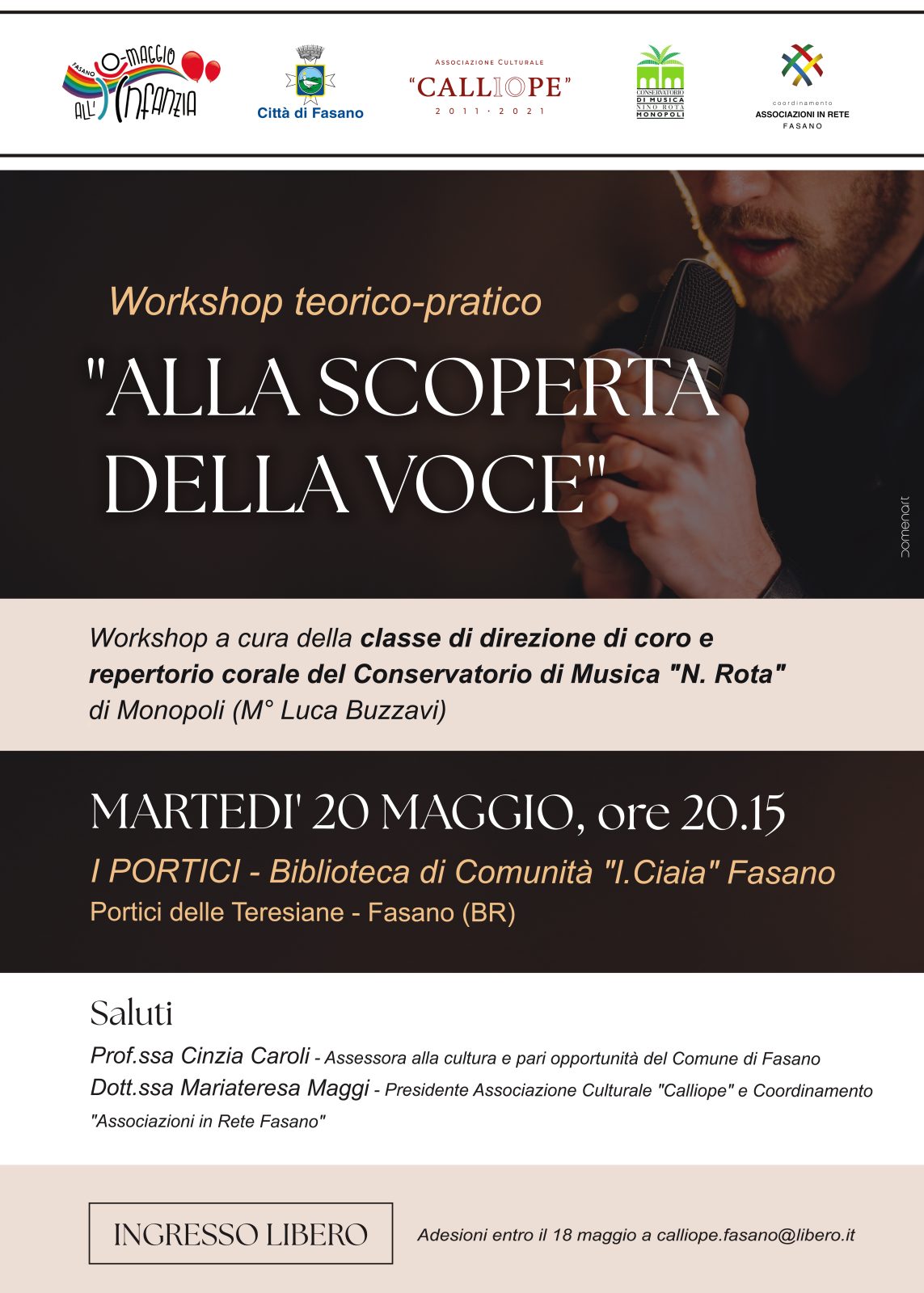 Martedì 20 maggio alle ore 20.15 presso I Portici- Biblioteca di Comunità “I.Ciaia” Fasano: incontro teorico-pratico “Alla scoperta della voce” a cura della classe di Direzione di coro e repertorio corale del M° Luca Buzzavi- Conservatorio “N. Rota” di Monopoli, rivolto a studenti, direttori di coro, insegnanti ed educatori curiosi di esplorare la voce e le sue potenzialità, grazie alla disponibilità del Direttore M° Gianpaolo Schiavo. Adesioni al 3347030282 o calliope.fasano@libero.it