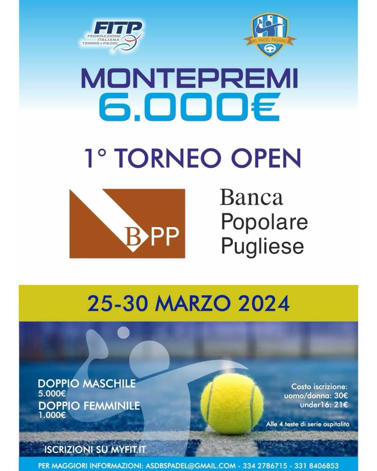 FASANO – Una settimana di padel ad alto livello nelle gabbie della Bs Padel Fasano, dove nella giornata di lunedì scorso ha preso il via l’Open Banca Popolare Pugliese, kermesse al debutto che ha attirato in zona atleti provenienti da tutta Italia che si daranno battaglia fino a sabato prossimo per puntare al montepremi finale di 6mila euro (5mila euro per il Doppio Maschile, mille euro per il Doppio Femminile) nella cornice del centro sportivo Bs Sport sito in contrada San Pietro a Fasano.