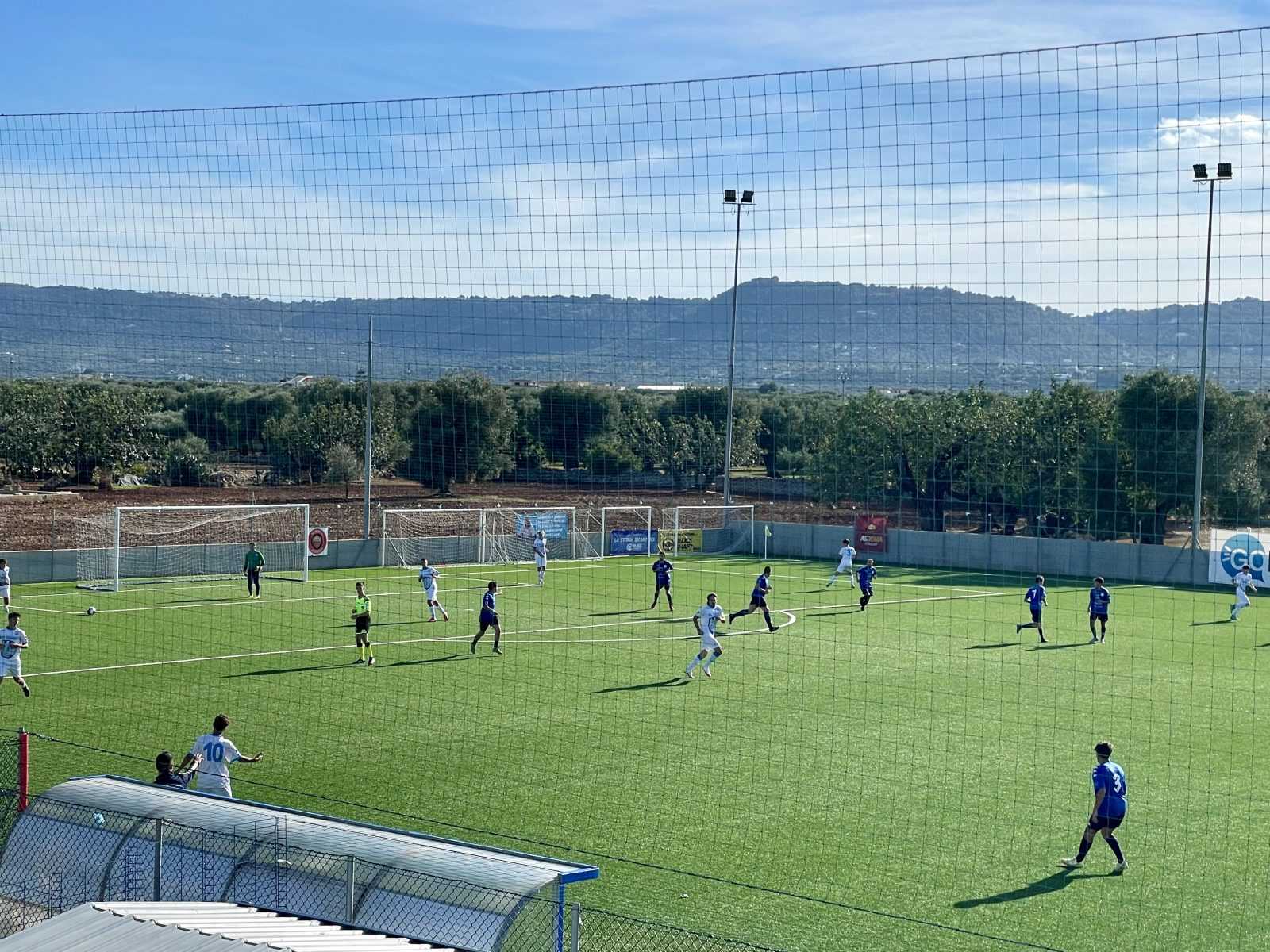 FASANO – La Bs soccer team Fasano e l’Esperia Monopoli si sono dati battaglia all’Arena degli Ulivi e alla fine a spuntarla è stato l’equilibrio ma solo in termini di risultato (2-2). Grande rammarico per i locali, si è giocato a campi invertiti rispetto al calendario, ma alla fine non è arrivato il risultato sperato. Forse l’ampio turn-over di Semeraro che ha scelto di preservare buona parte degli over a disposizione schierandone soltanto i due, Pace e Palmisano, ha visto i fasanesi partire con un undici iniziale dall’età media di 18,9 anni. Un mix di ragazzi del campionato Allievi e Juniores che però sono riusciti ampiamente a dire la loro nonostante il divario esperienziale tra le due formazioni. Inizio cinico di Pace e compagni che la sbloccano dopo soltanto tre giri di lancette con Di Bari il quale sorprende la difesa monopolitana e insacca alle spalle del portiere Olive.