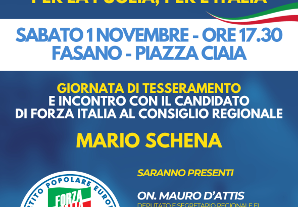 Sabato 1° novembre in piazza l’incontro con il candidato al Consiglio regionale, Mario Schena. Presenti D’Attis, De Mola e...